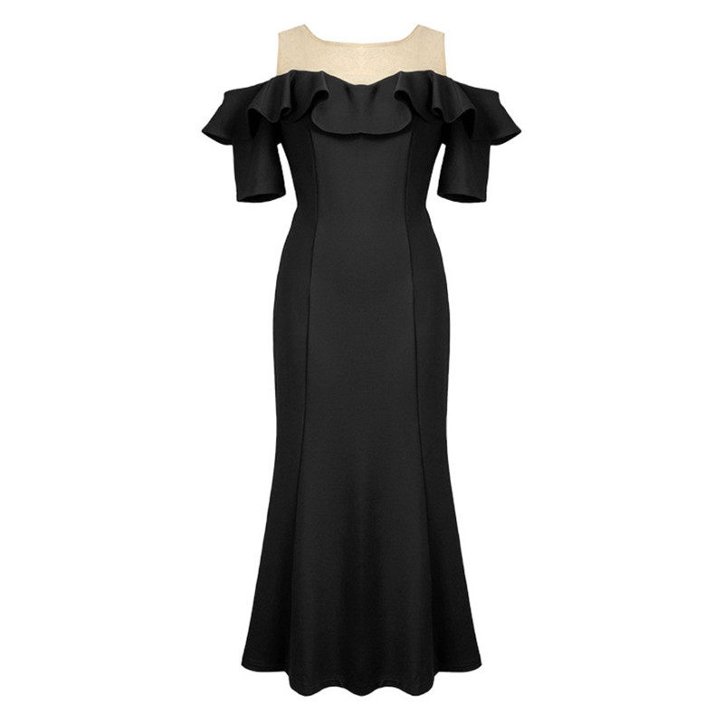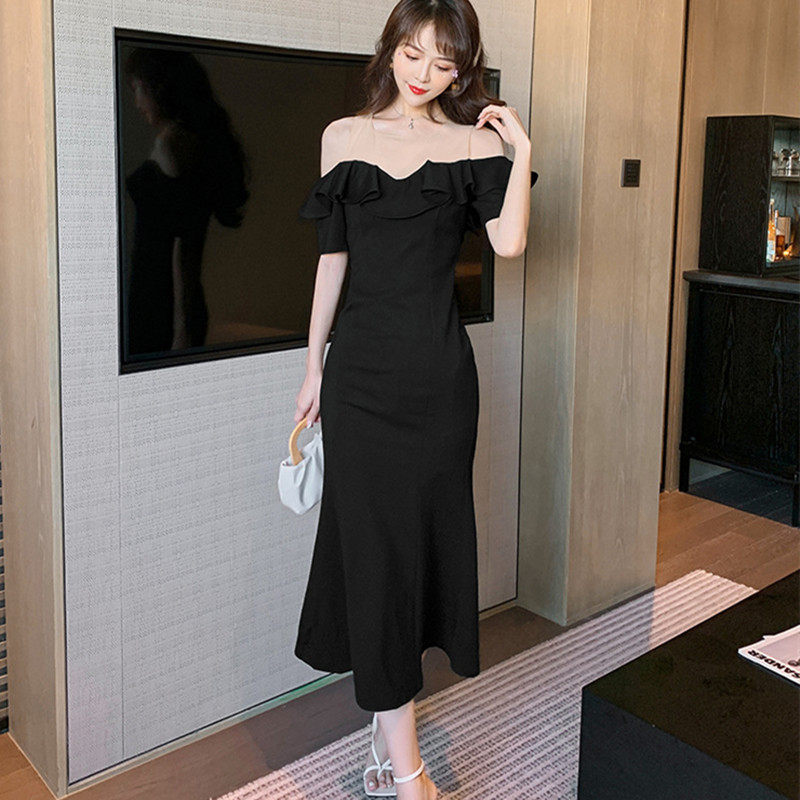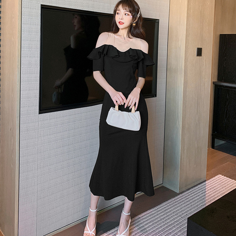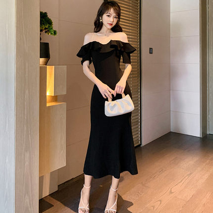 气质性感一字肩赫本风小黑裙夏新款法式复古荷叶边包臀鱼尾连衣裙