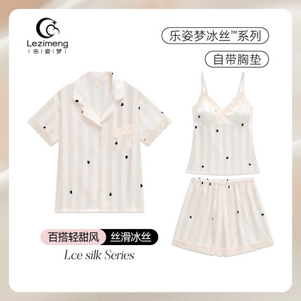 冰丝睡衣女夏季带胸垫性感吊带短袖短裤蕾丝三件套装纯欲风家居服