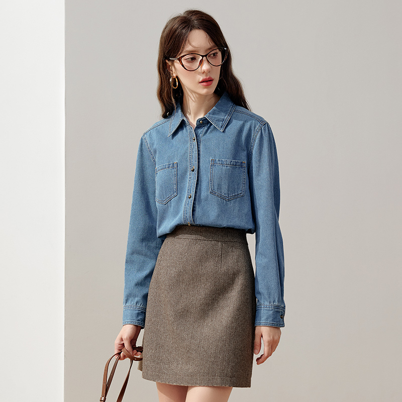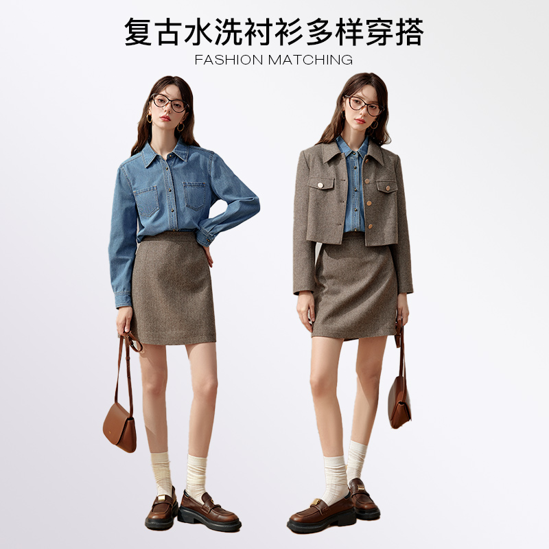 牛仔衬衫女蓝色长袖上衣kbne2025春季新款慵懒设计感时尚洋气衬衣