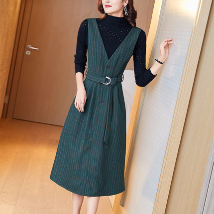 连衣裙背带春秋款条纹打底套装