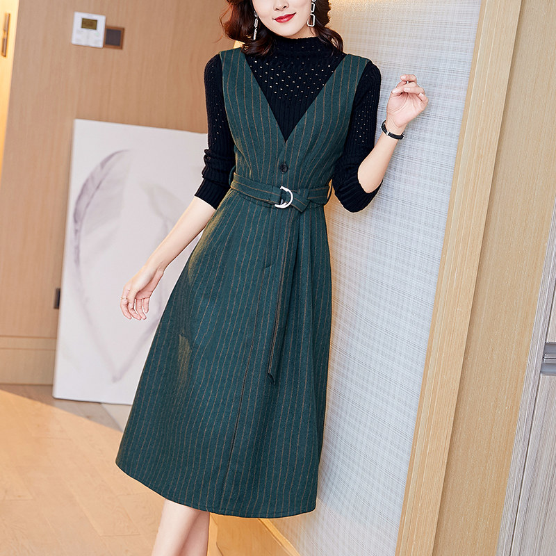 背带裙女2025年春秋款条纹打底毛呢连衣裙显瘦套装毛衣春秋两件套