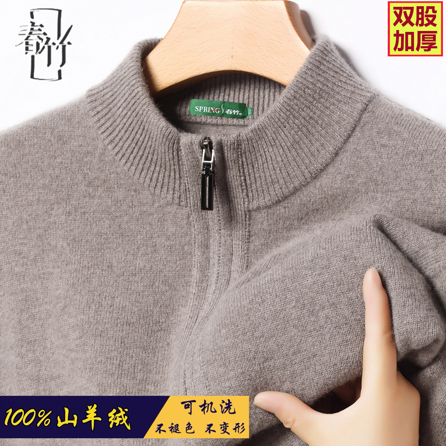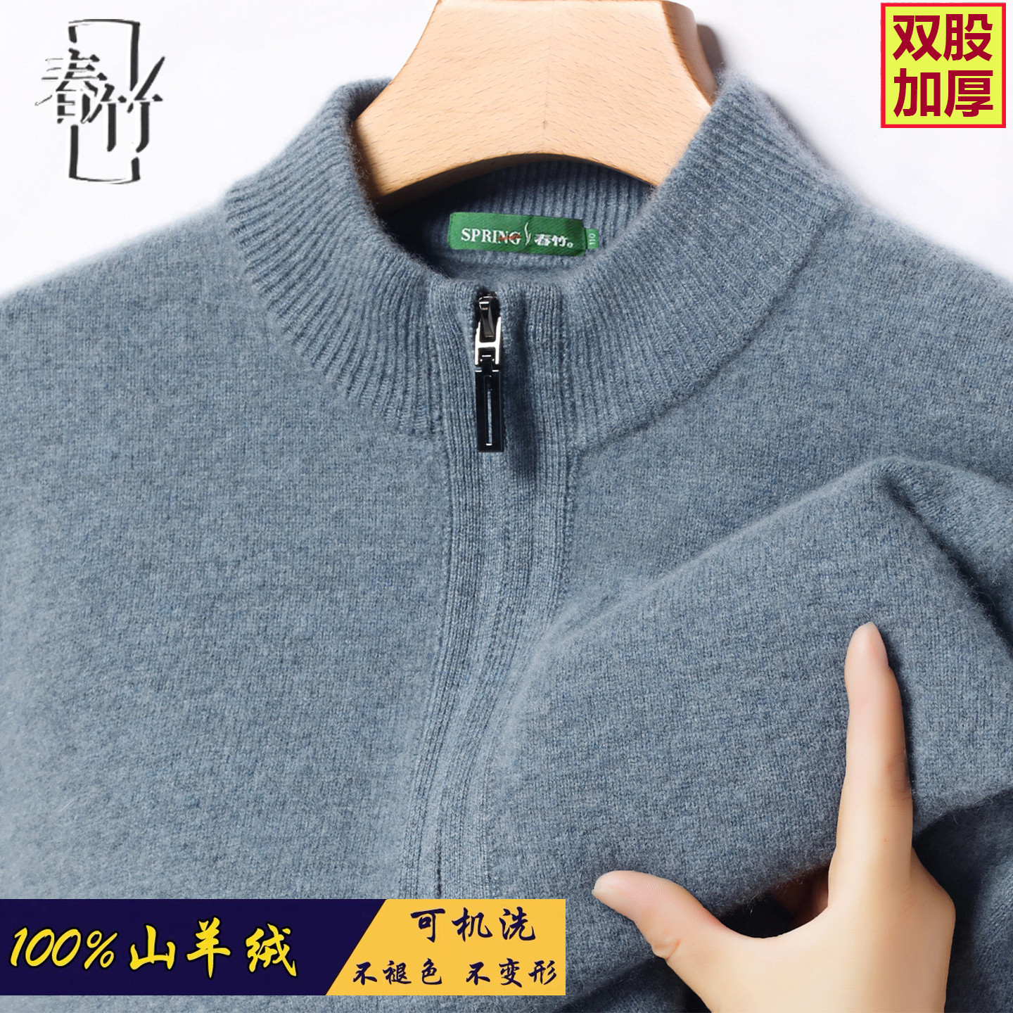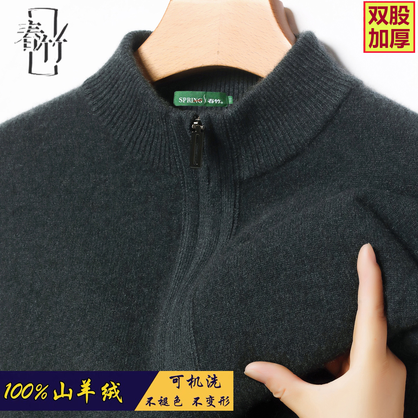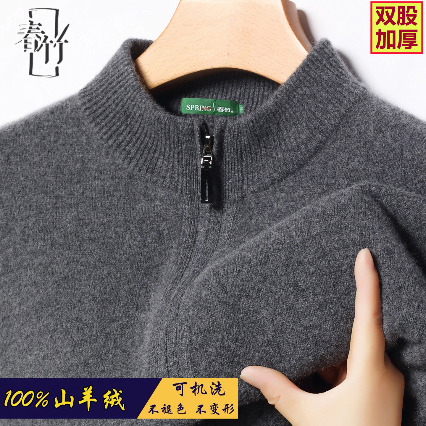 正品春竹男装100%羊绒衫半高拉链三股加厚保暖针织可机洗高端毛衣