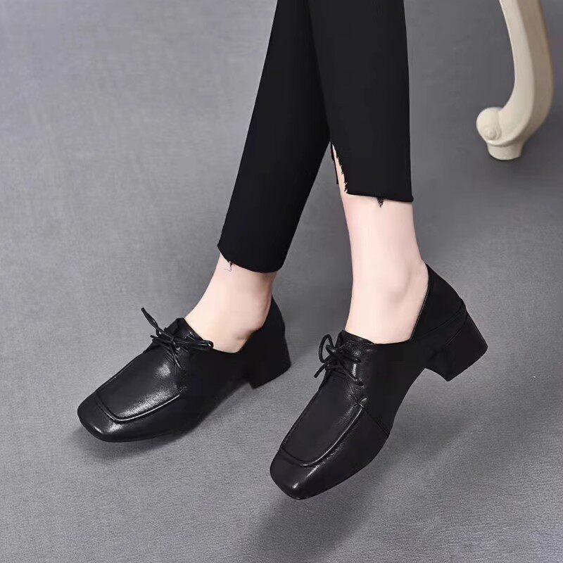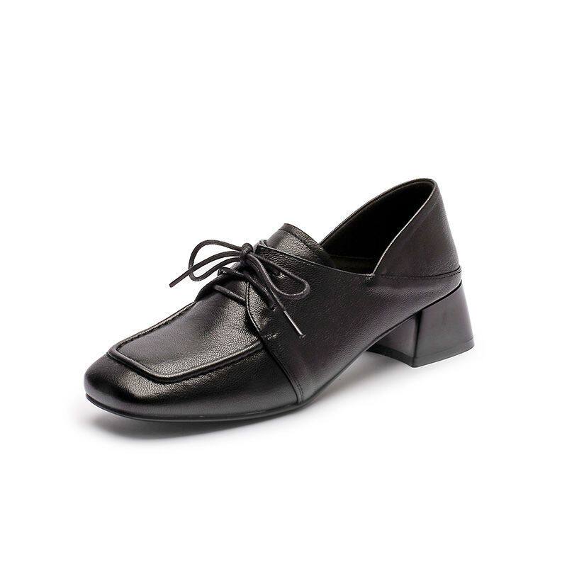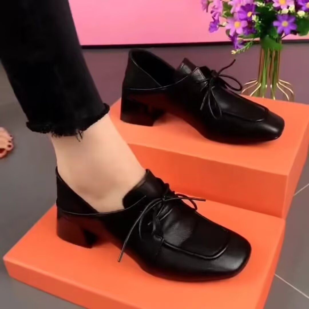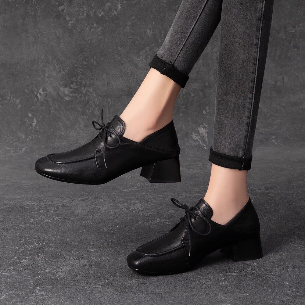2025年春季新款真皮百搭深口单鞋女中跟系带粗跟方头英伦风小皮鞋