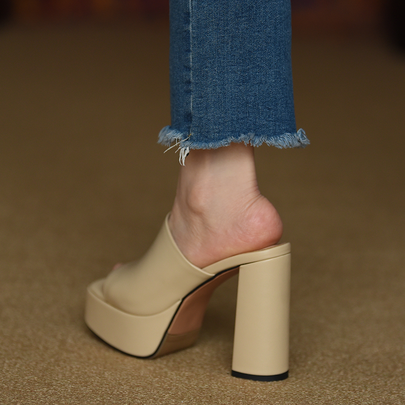 misili 真皮外穿粗跟凉拖鞋女2025夏季新款方头高跟女鞋厚底凉鞋