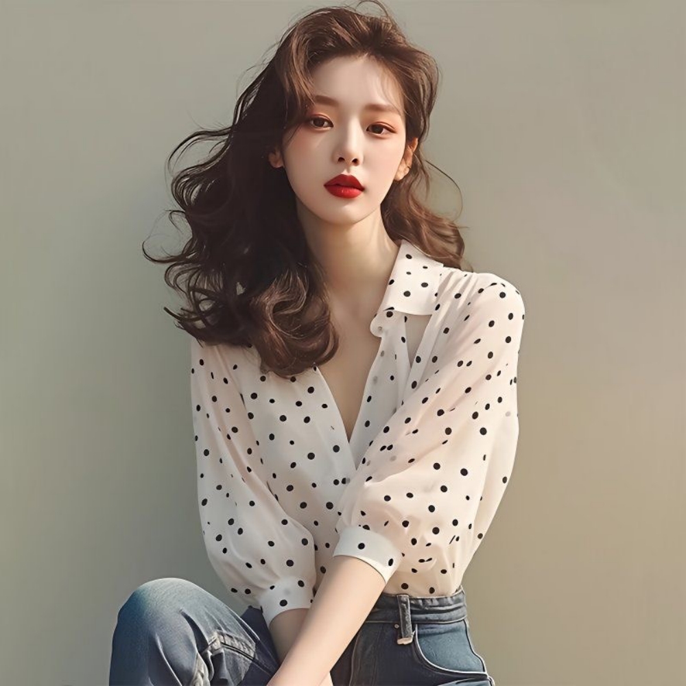 华来阿玛施特2025春夏新款Polo领波点雪纺衬衫宽松灯笼七分袖小衫