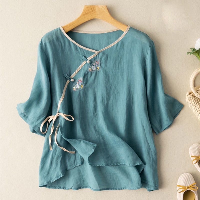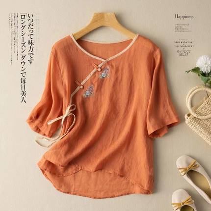民族风斜襟盘扣刺绣短袖棉麻上衣