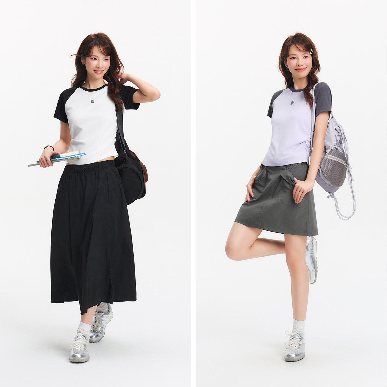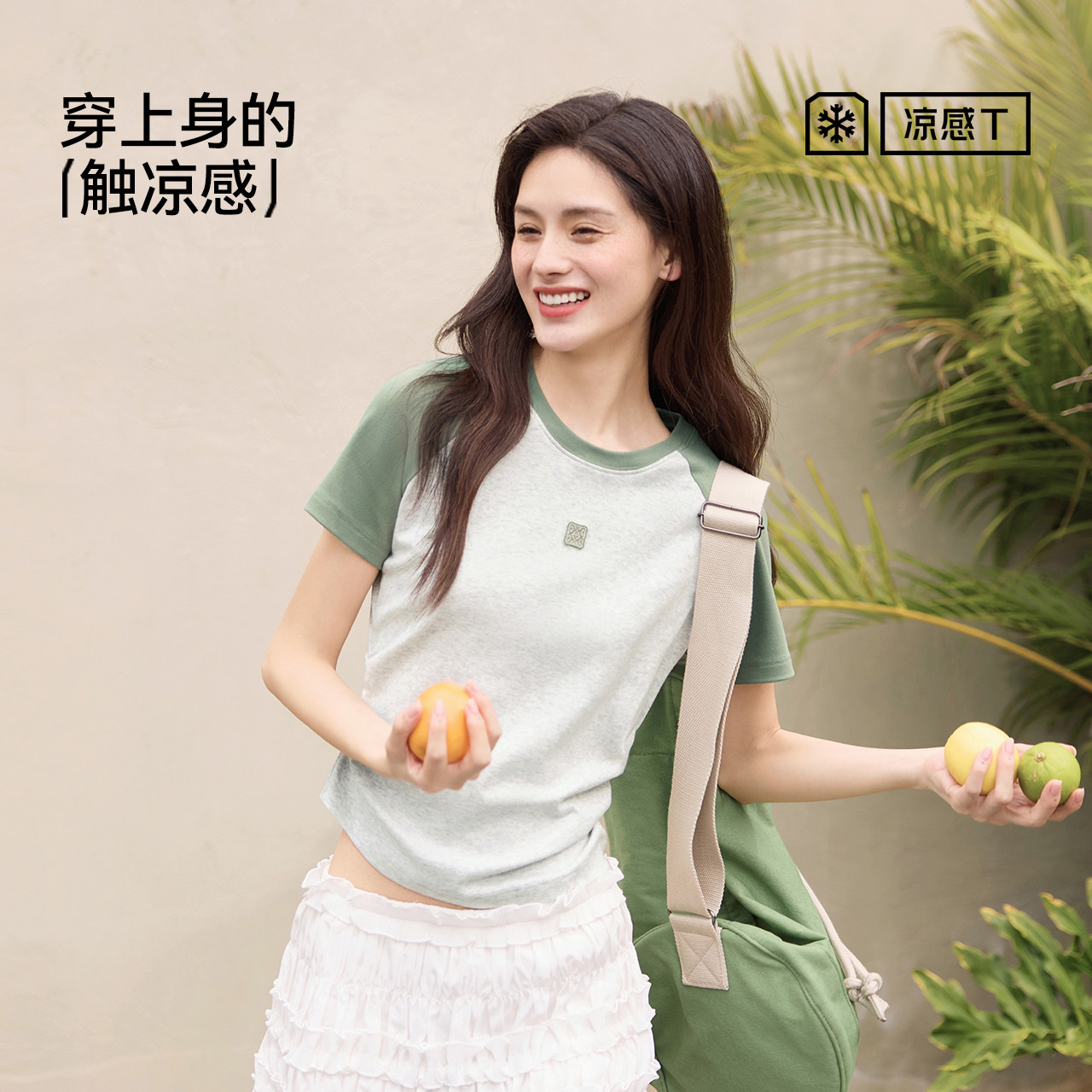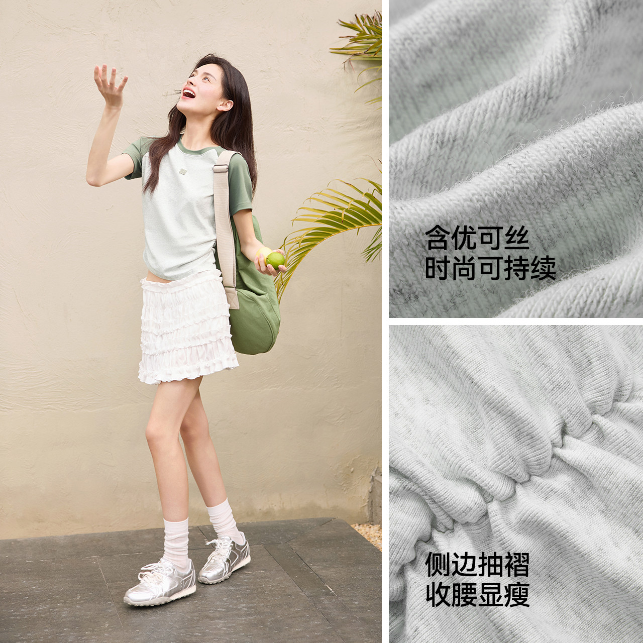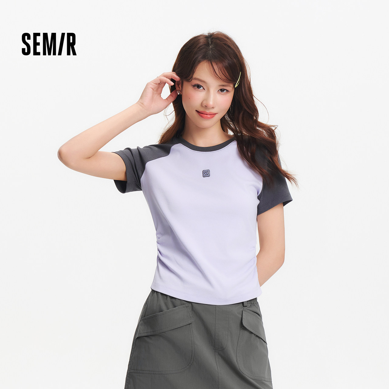 凉感T|森马短袖T恤女夏季撞色插肩袖修身褶皱刺绣显瘦小心机上衣