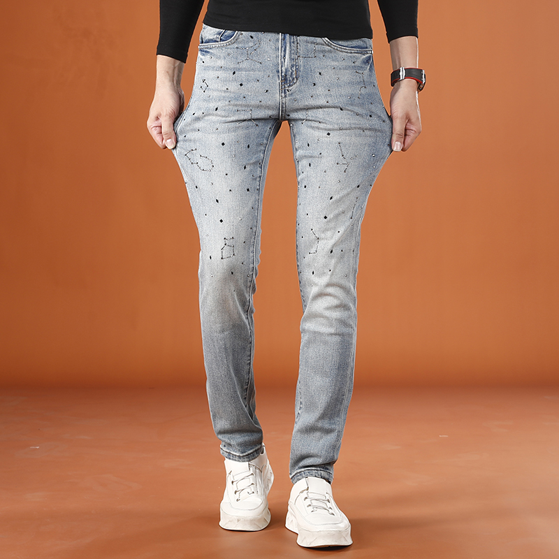 2025新款潮牌时尚烫钻男士牛仔裤秋冬款潮流弹力修身显瘦小脚长裤