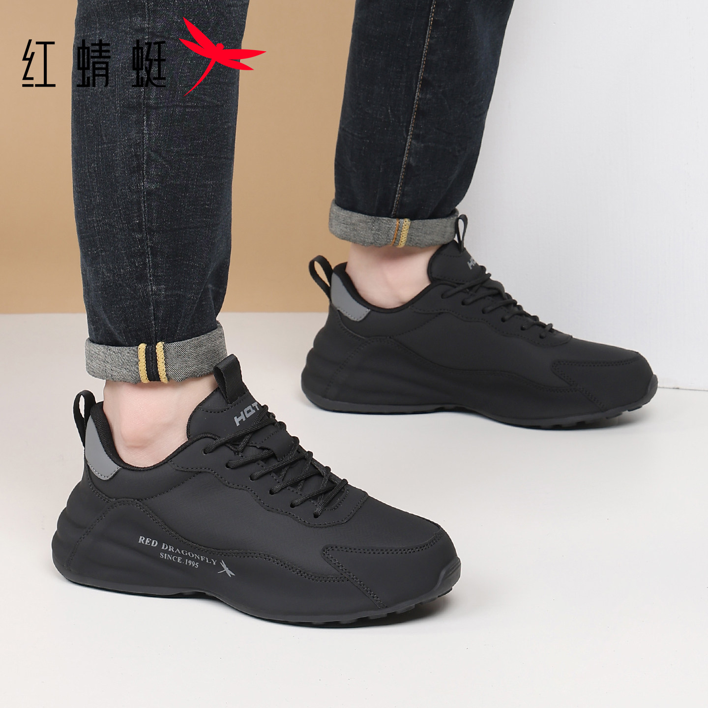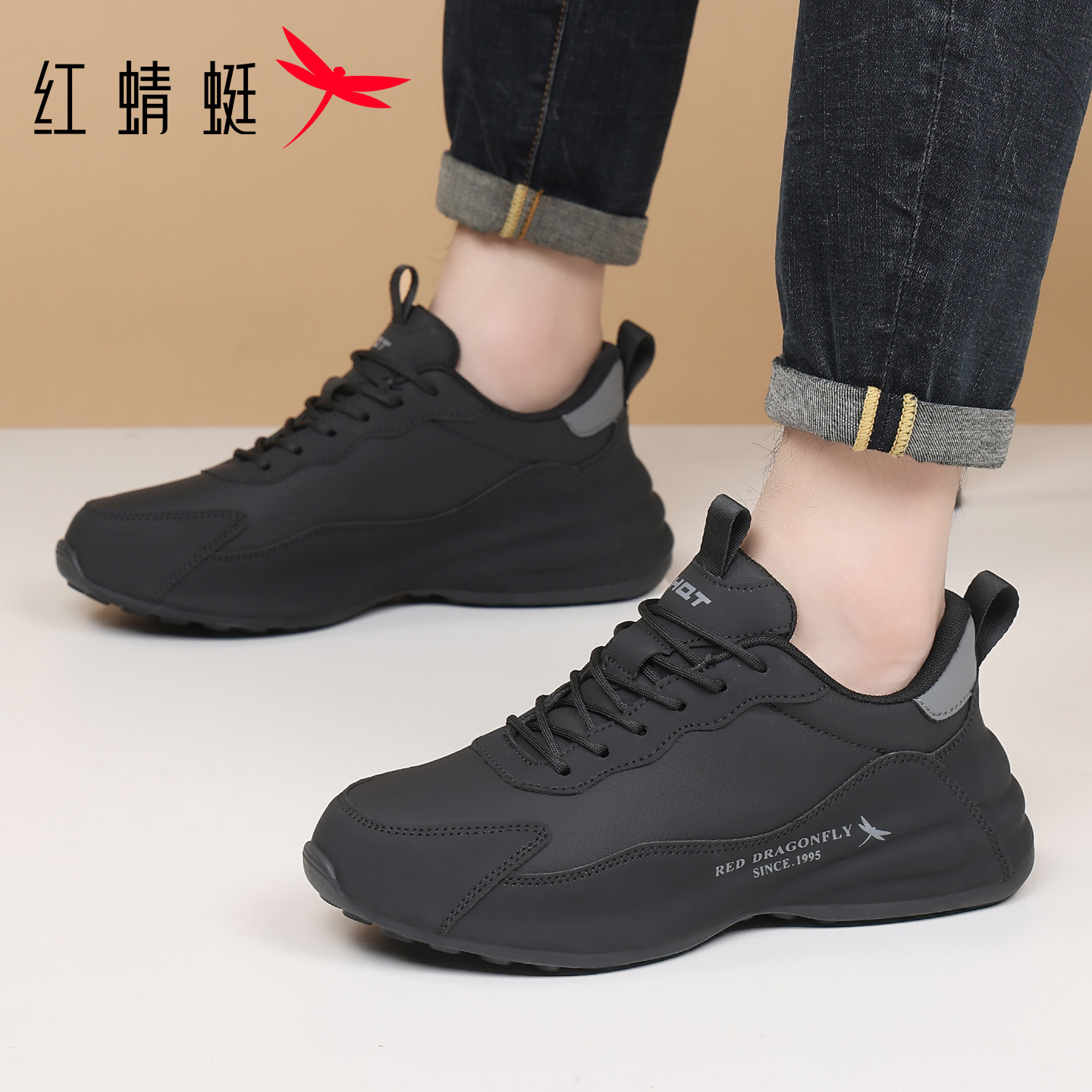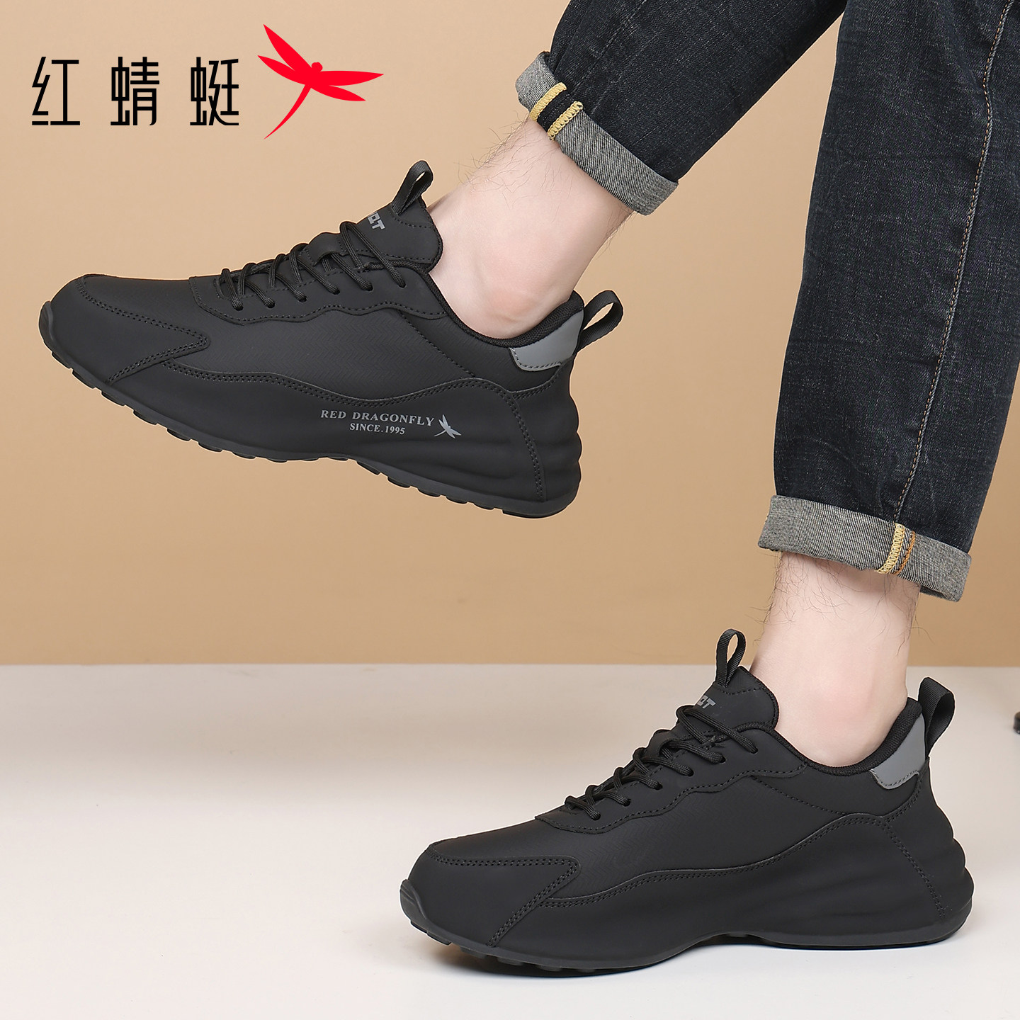 红蜻蜓皮面厚底增高休闲运动鞋男