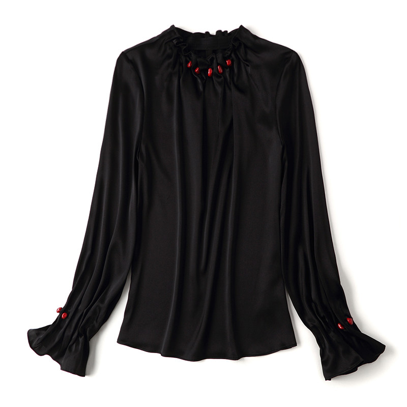 黑色真丝衬衫女复古港味2025春秋新款洋气喇叭袖重磅桑蚕丝上衣潮