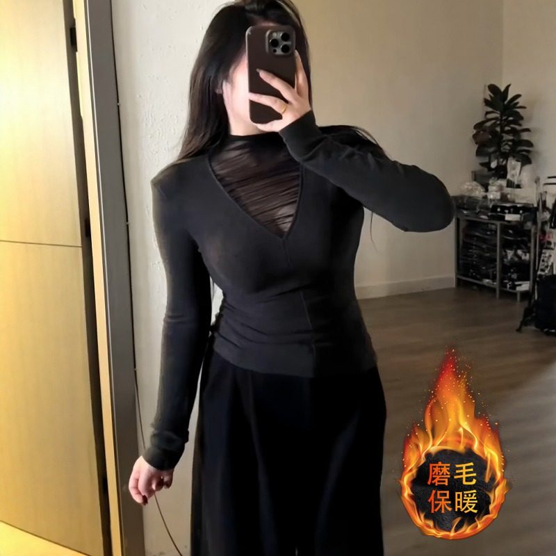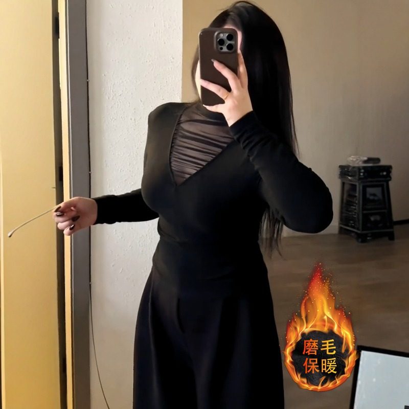 大码黑色网纱拼接长袖打底衫T恤女秋冬胖mm加绒磨毛气质内搭上衣