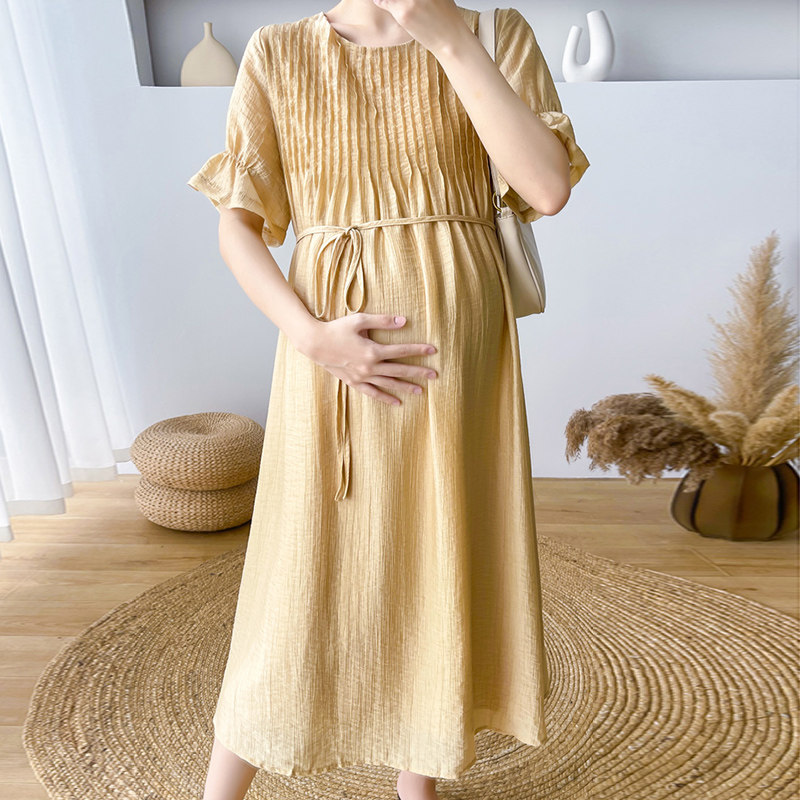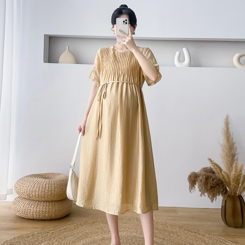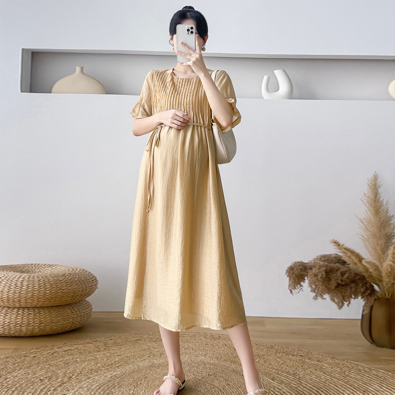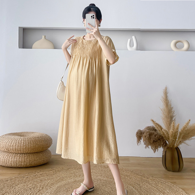 孕妇装夏天裙子中长款时尚设计感宽松过膝圆领长裙洋气短袖连衣裙