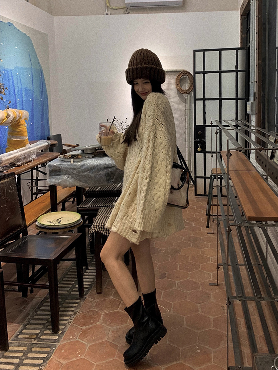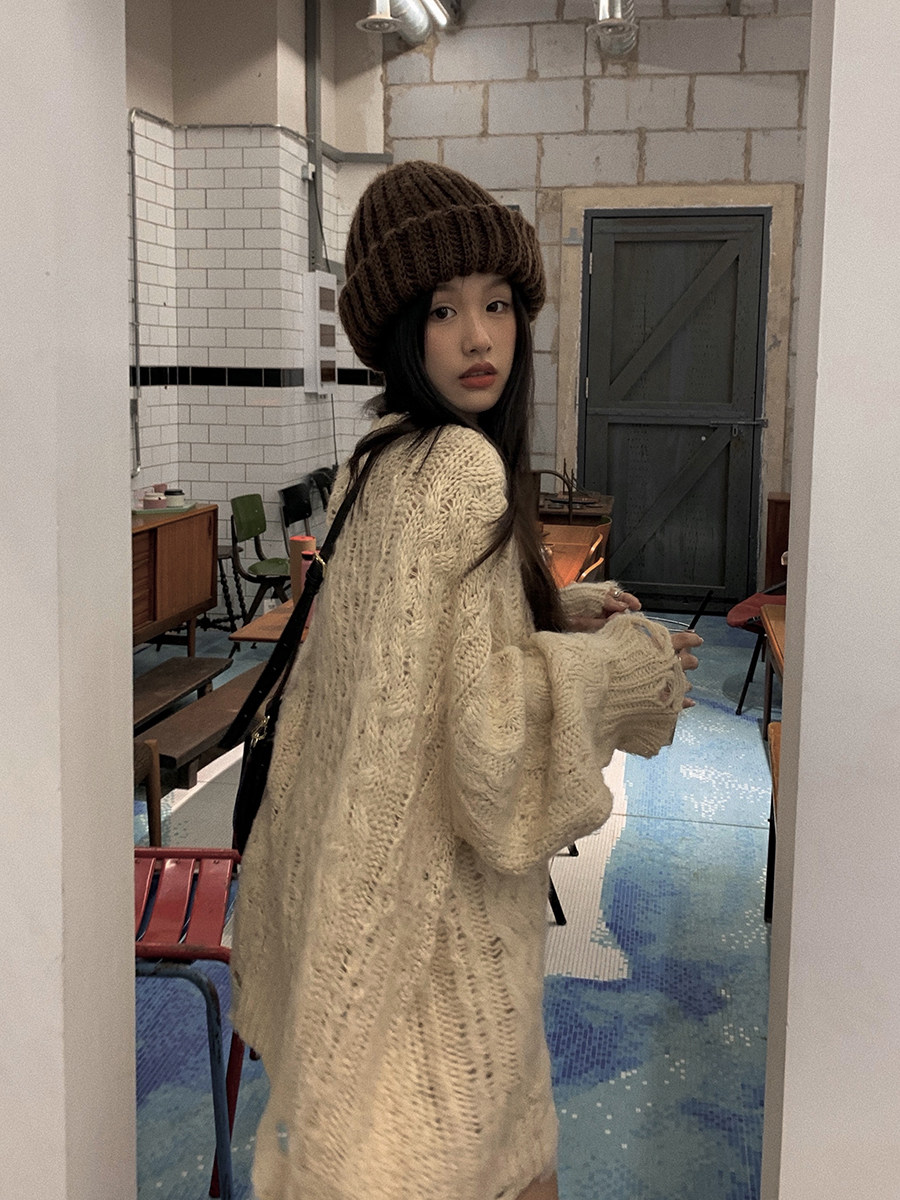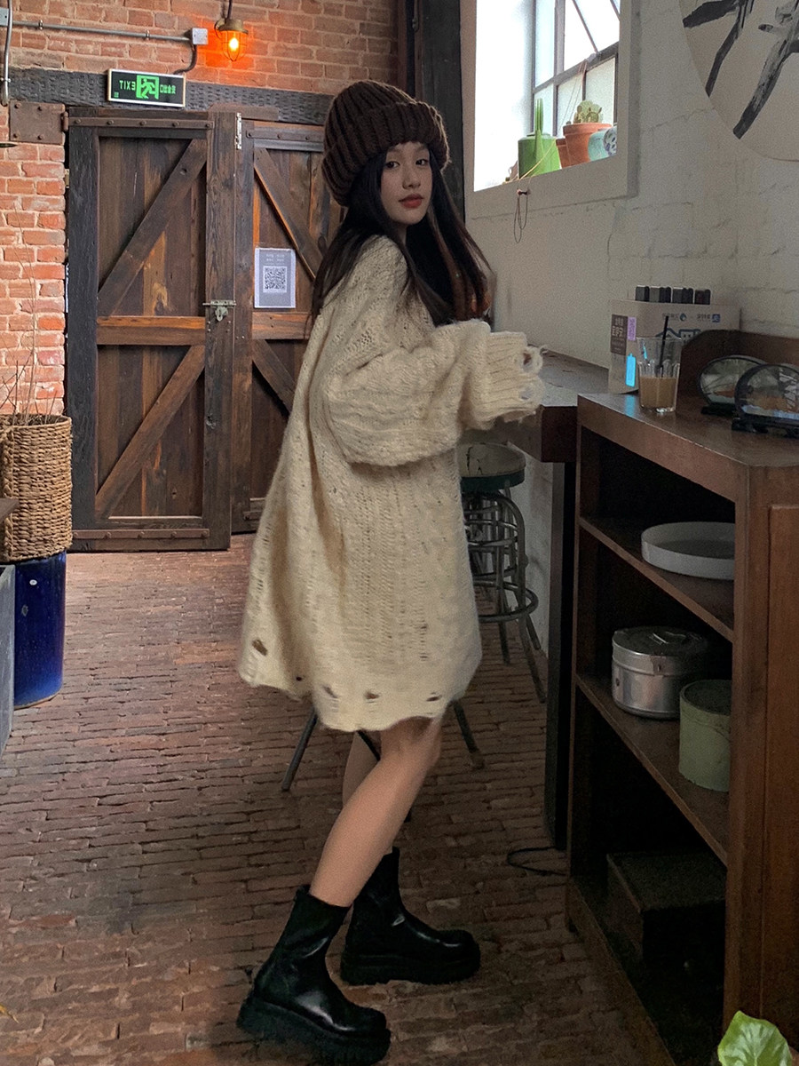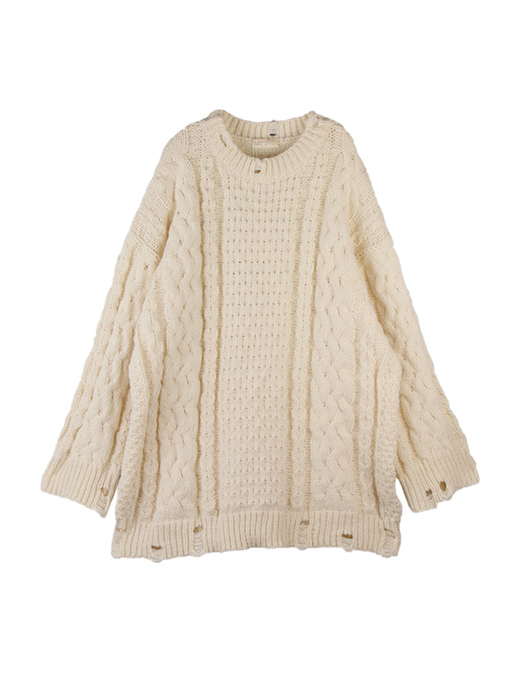 日系中长款镂空破洞毛衣女秋冬宽松慵懒风套头针织衫下身失踪上衣