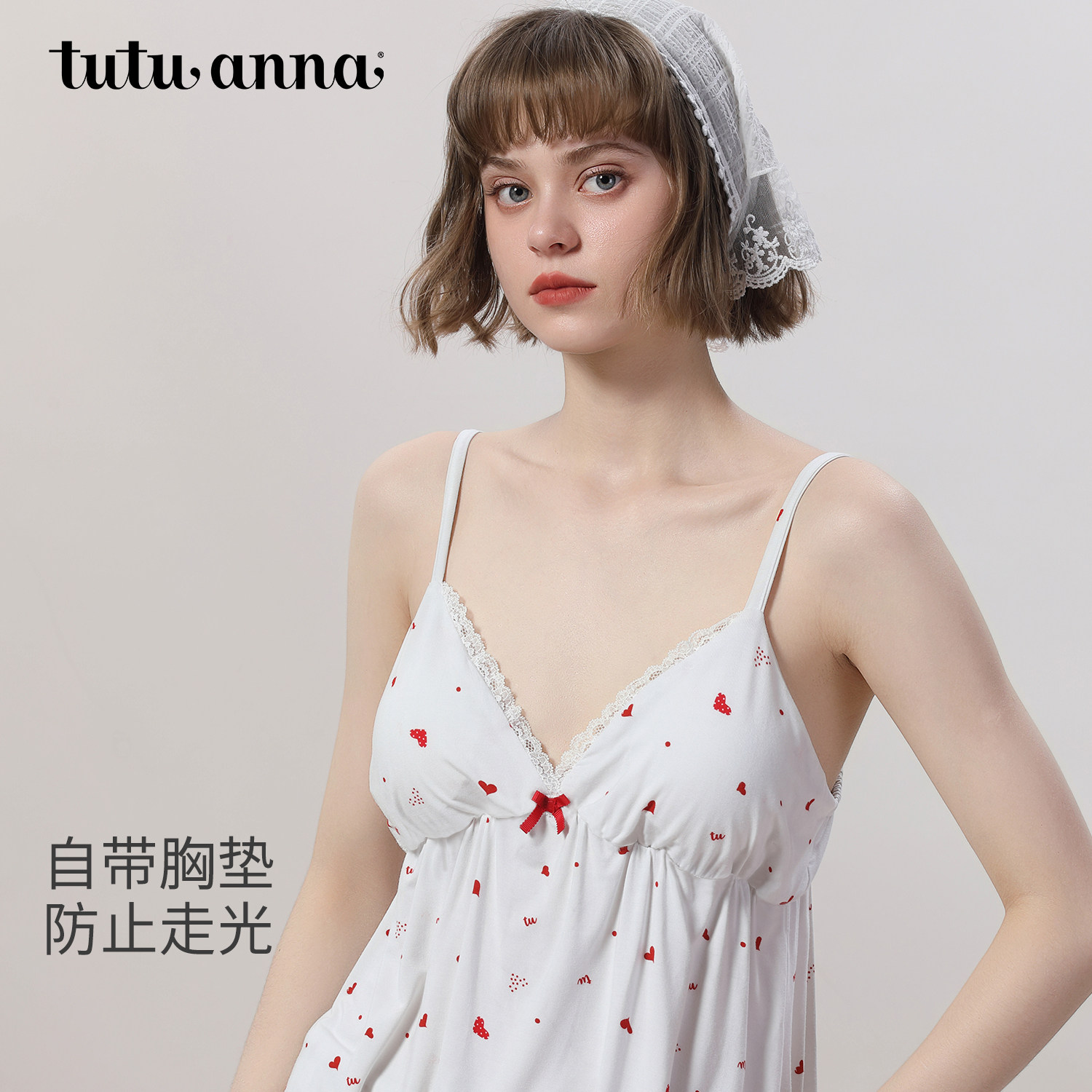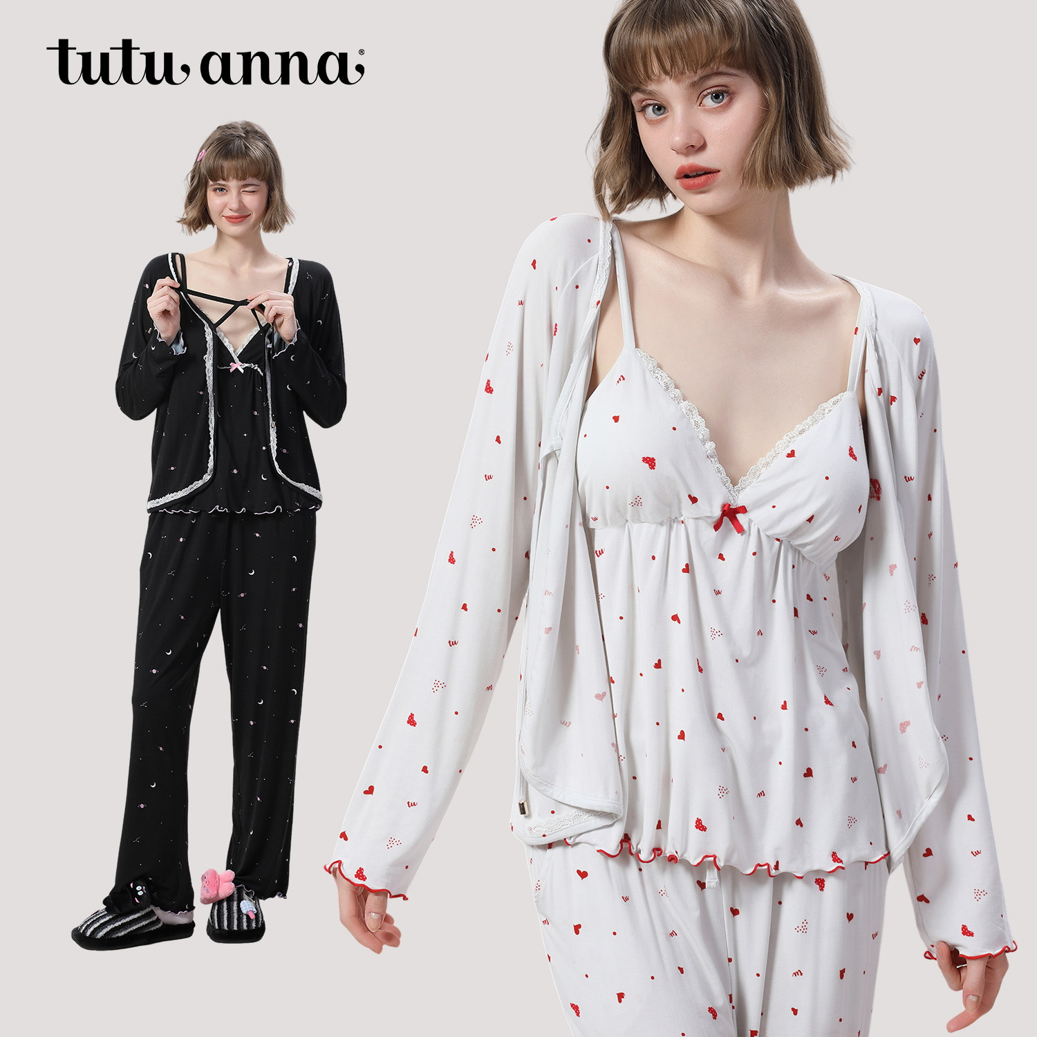 tutuanna春夏睡衣女 针织爱心满印带胸垫吊带上衣长袖家居服套装