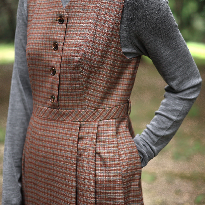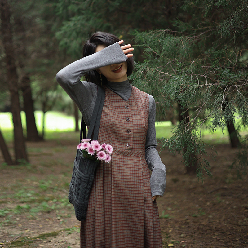 G25Q-032【枫叶丹】北京瓷片高端复古文艺红棕格纹减龄款背心裙