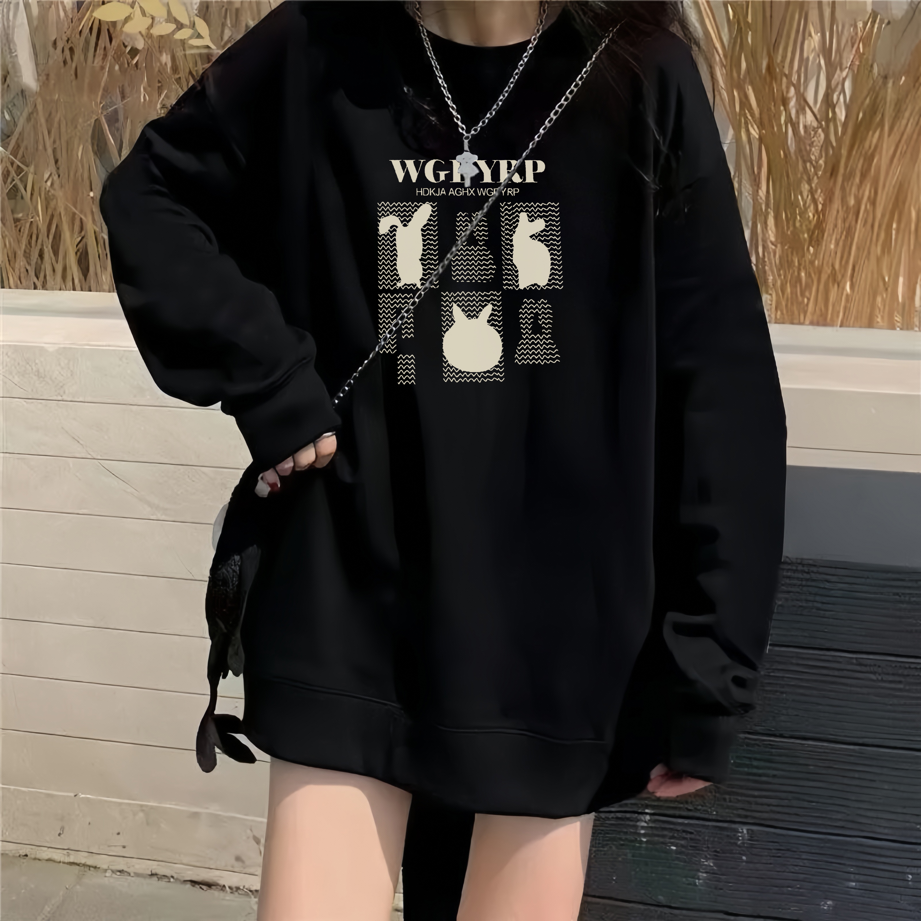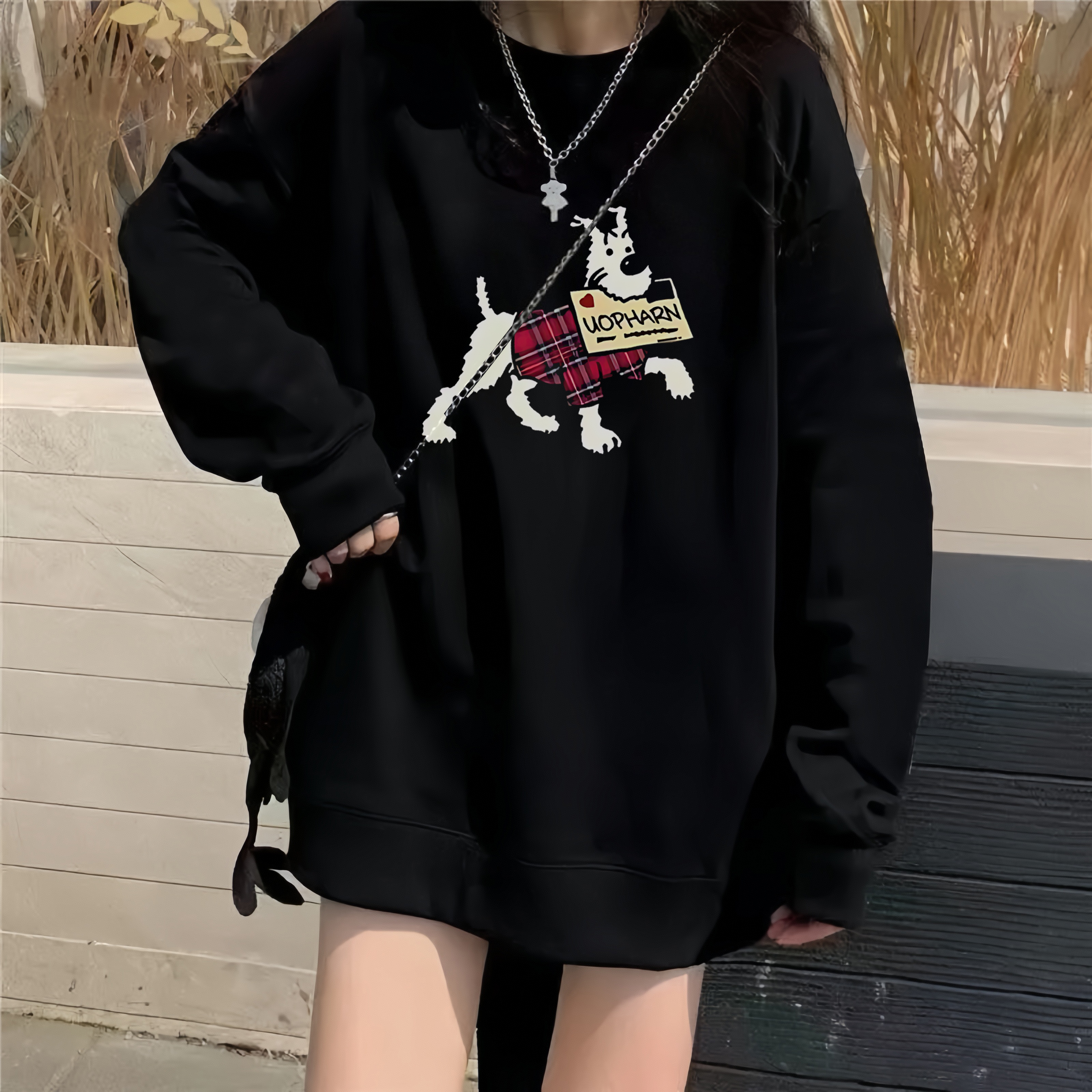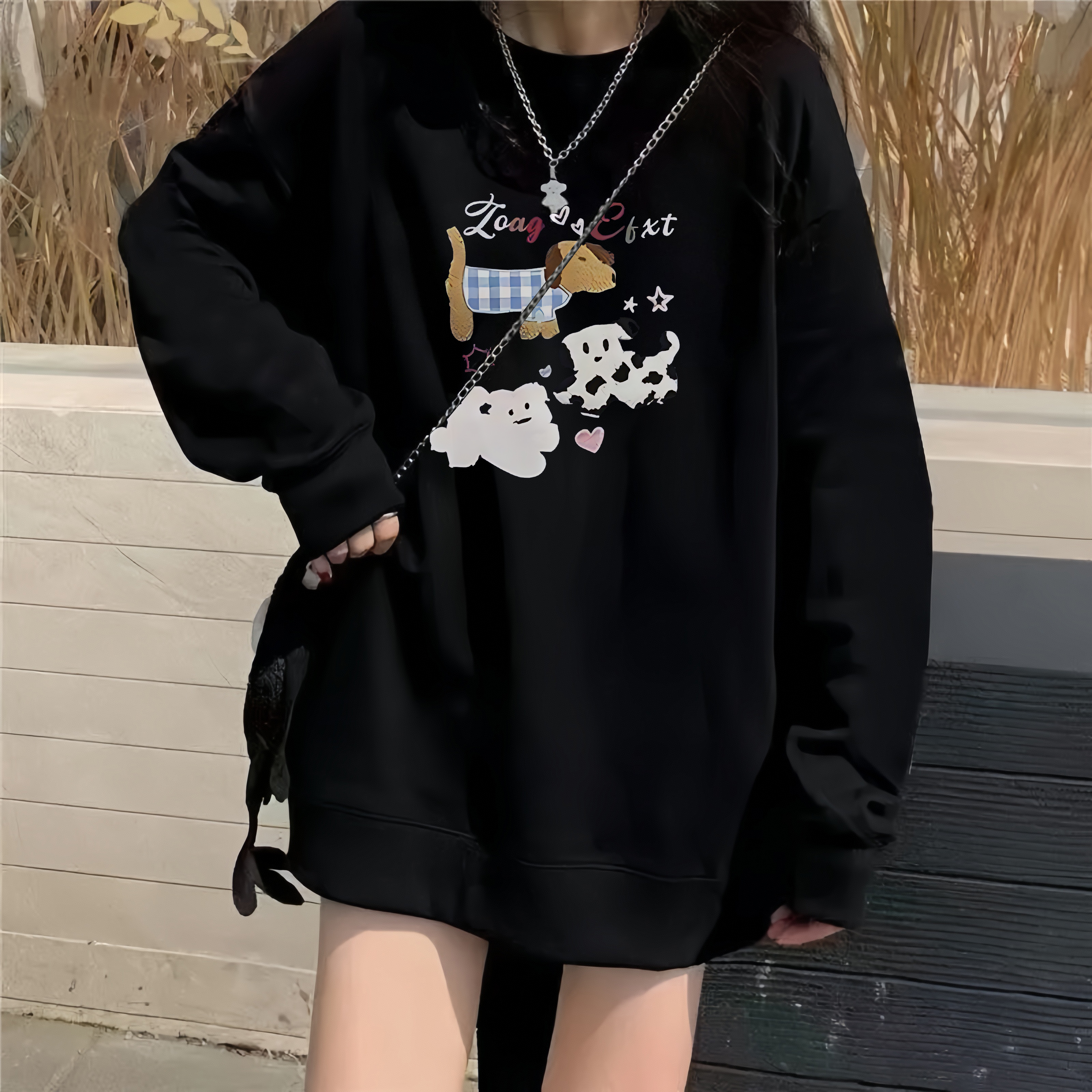 黑色纯棉圆领卫衣少女大童秋冬初中高中学生无帽宽松oversiz上衣
