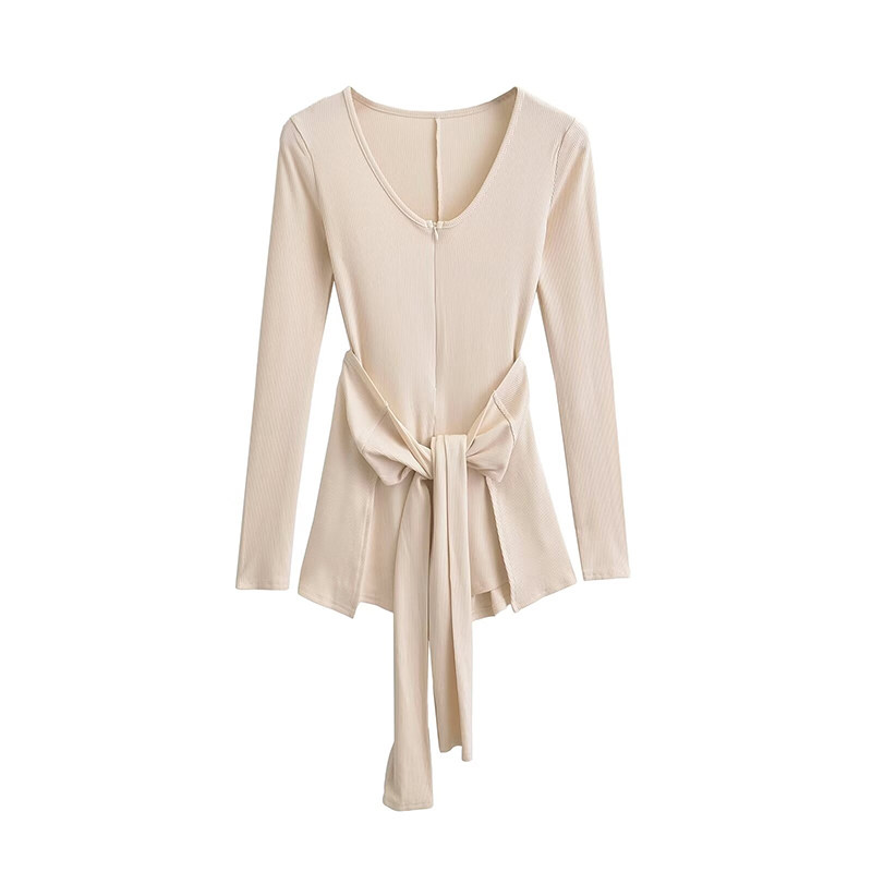 liviahome 性感拉链V领半开襟T恤女2025秋冬腰部绑带两件套连体衣