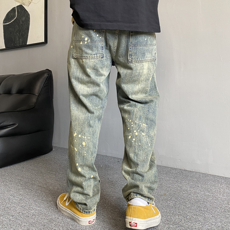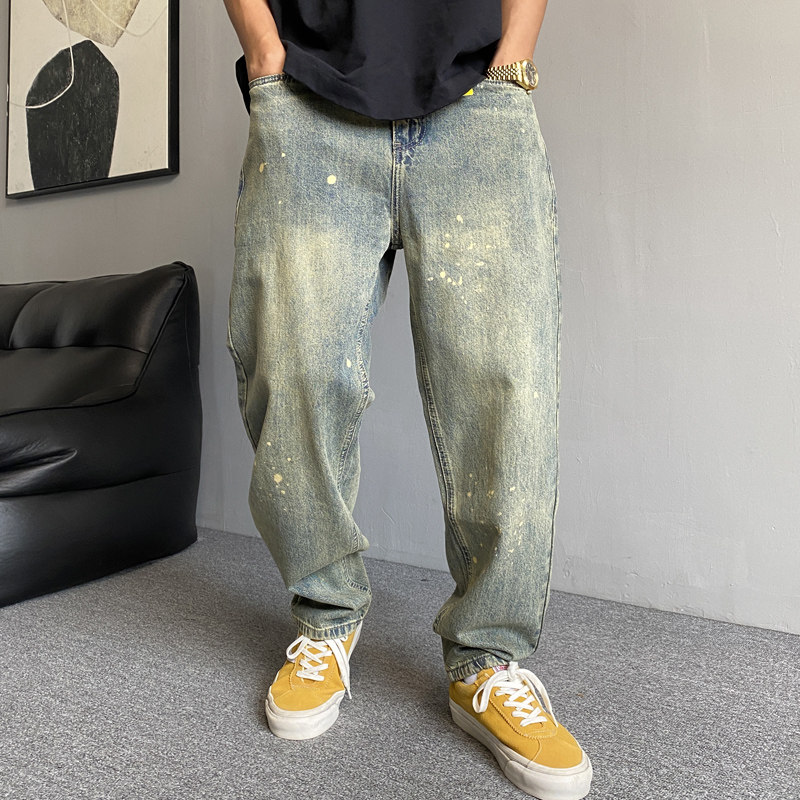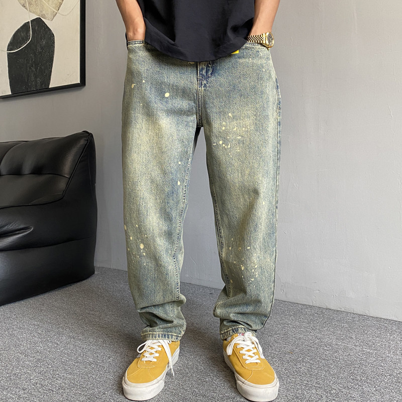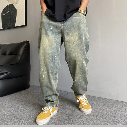 春季美式休闲痞帅水洗复古泼墨牛仔裤男直筒宽松大码百搭锥形裤子