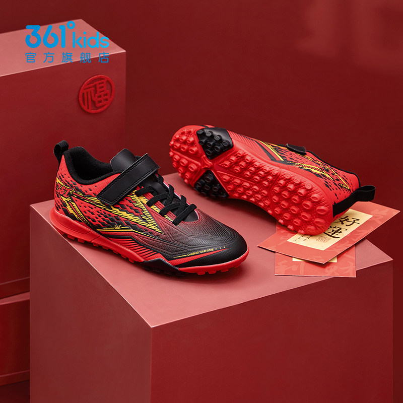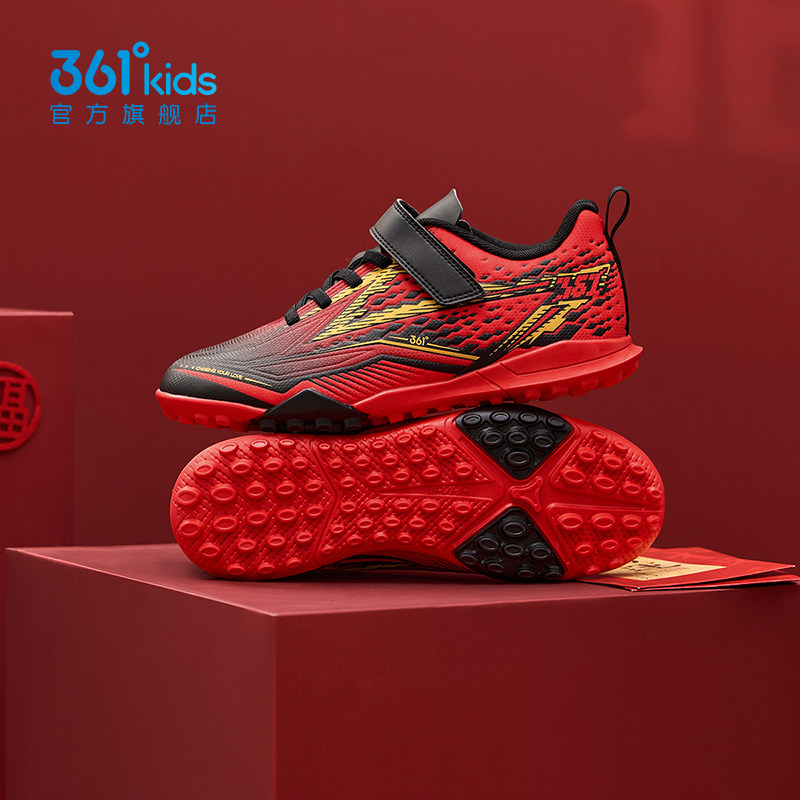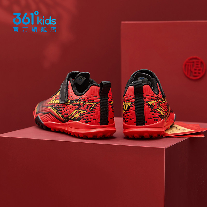 新年红色361童鞋男童足球鞋中大童皮面2026春新款软底防滑运动鞋