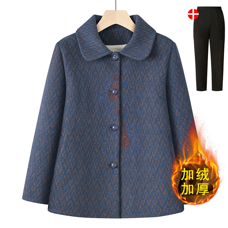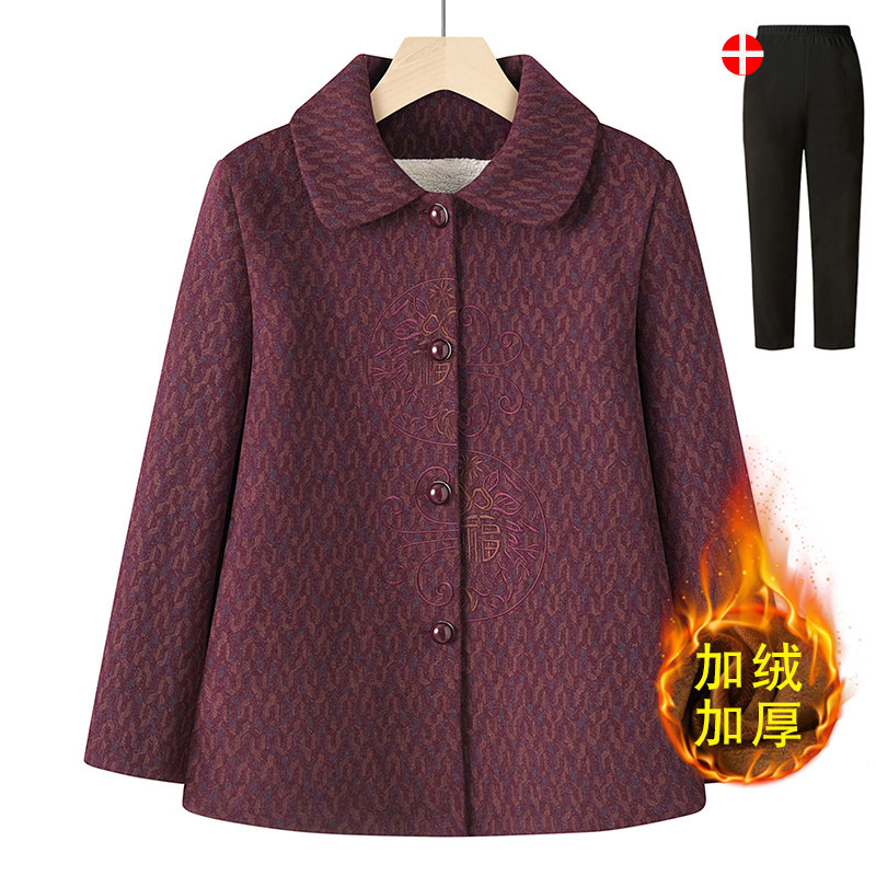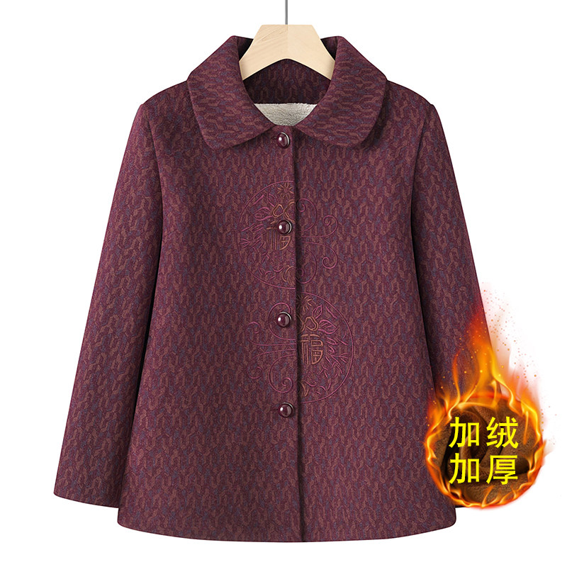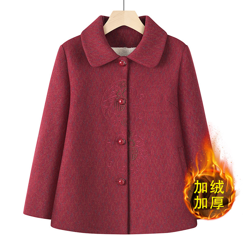 中老年人奶奶冬装加绒上衣妈妈装秋冬外套保暖翻领毛呢老太太衣服