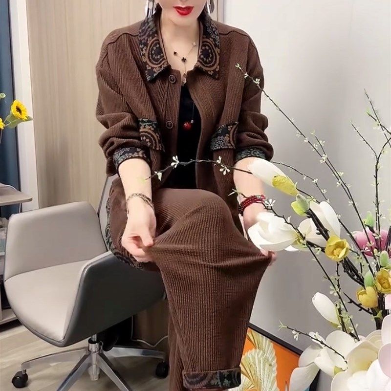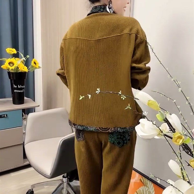 2024春季新款雪尼尔花翻领上衣加裤子两件套装时尚休闲中老年女装
