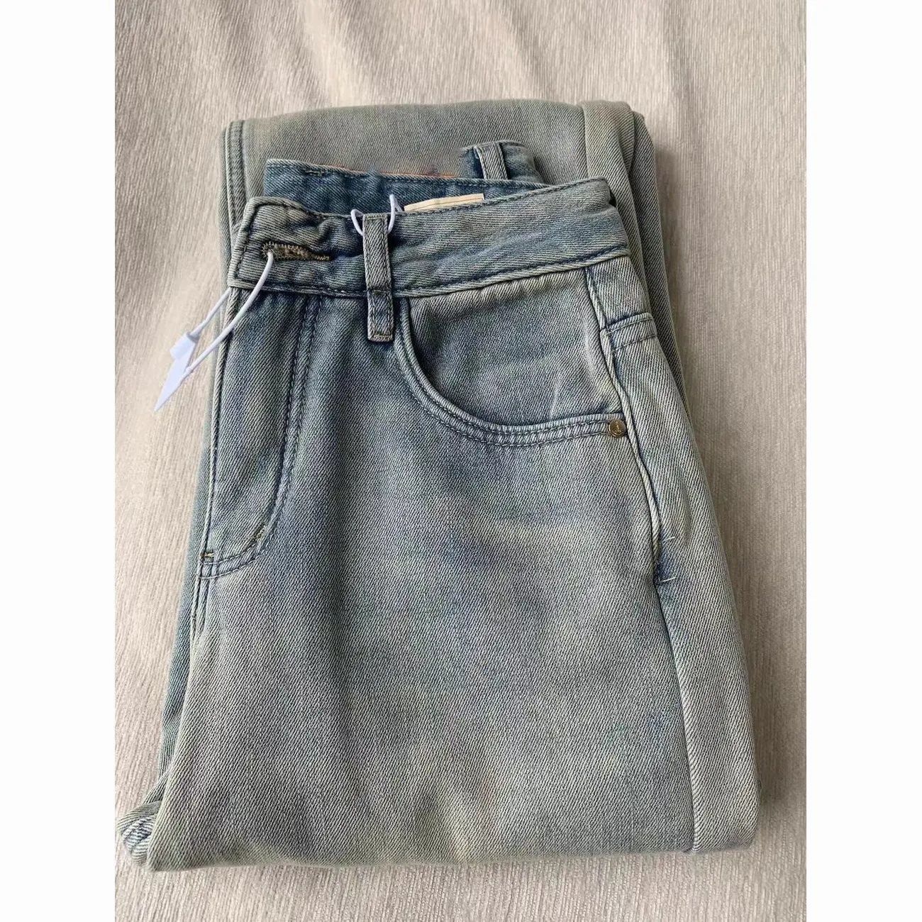 加绒加厚美式复古直筒牛仔裤女2025冬季新款高腰宽松阔腿拖地长裤
