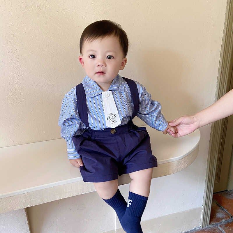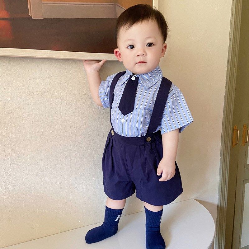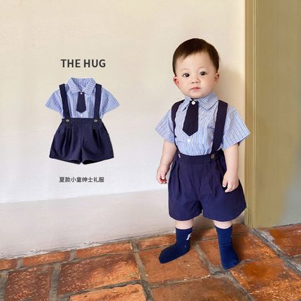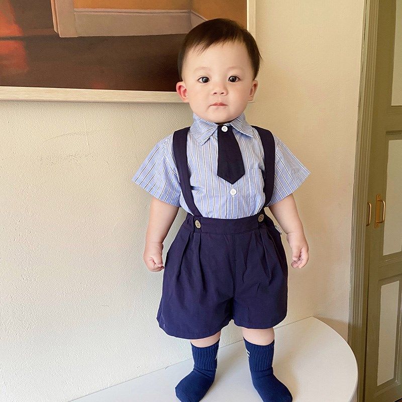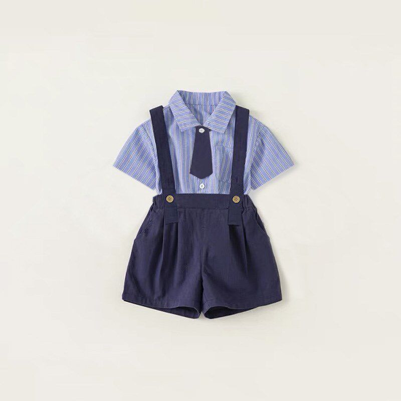 男童英伦学院风套装夏款宝宝翻领竖条纹衬衫短袖五分背带裤二件套