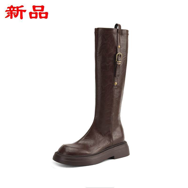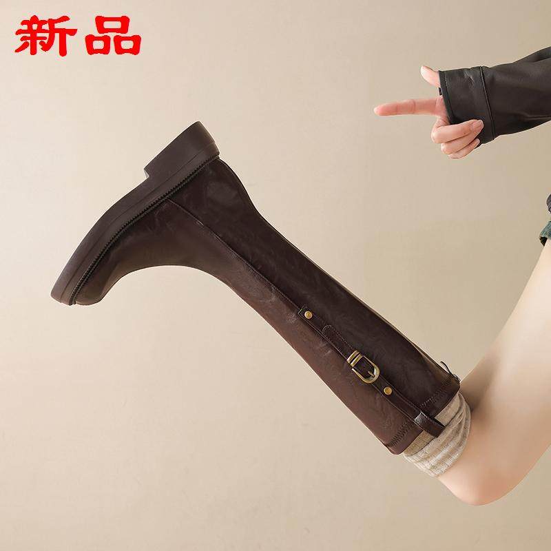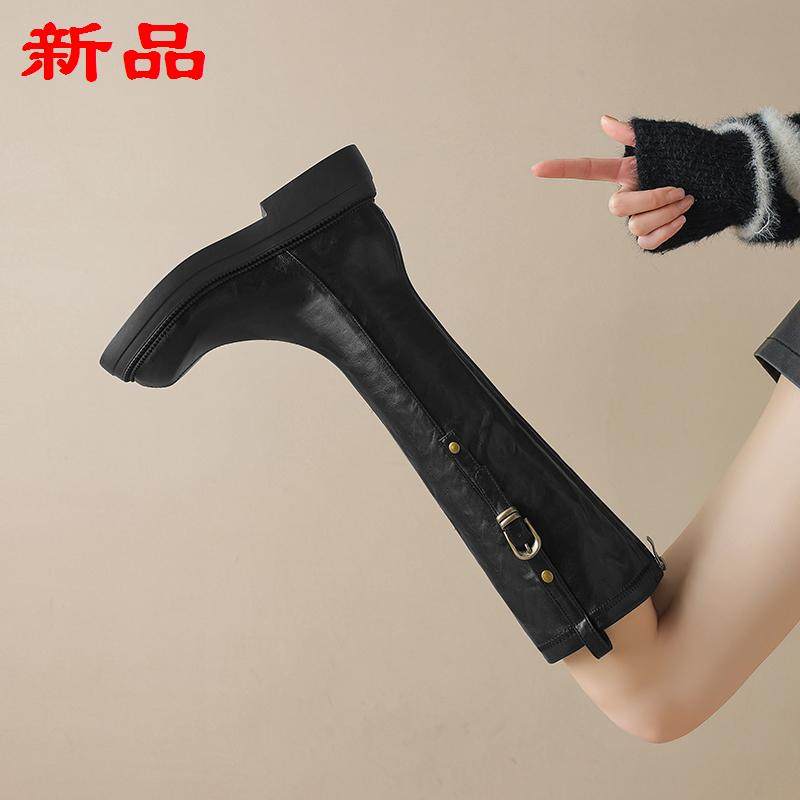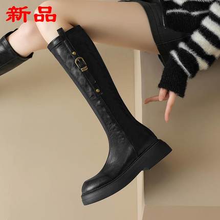 膝风粗高筒跟皮带扣靴秋冬厚底女骑士英伦真皮不过长筒靴长靴2025