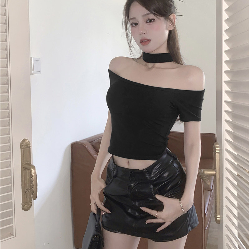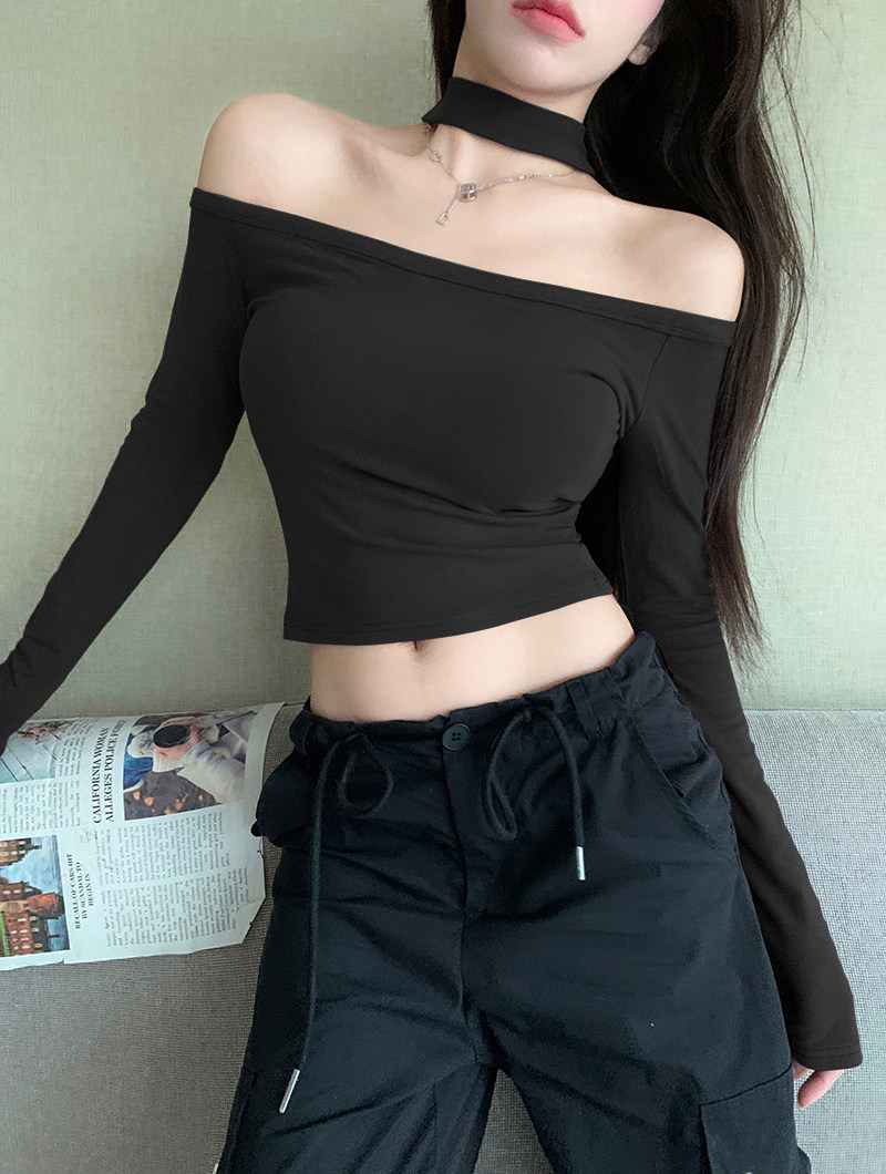 辣妹锁骨一字肩挂脖性感长袖t恤女秋季新款法式洋气独特别致上衣