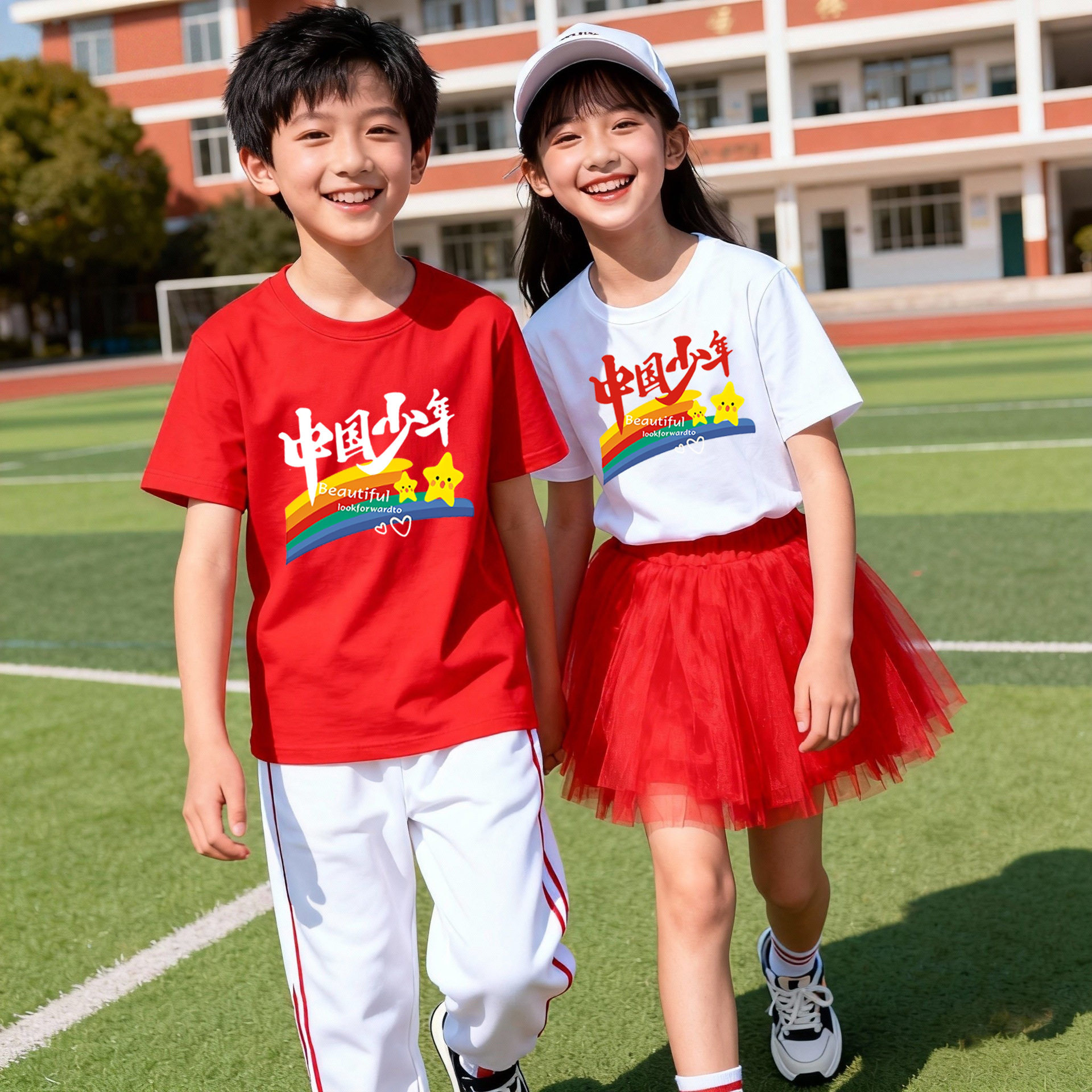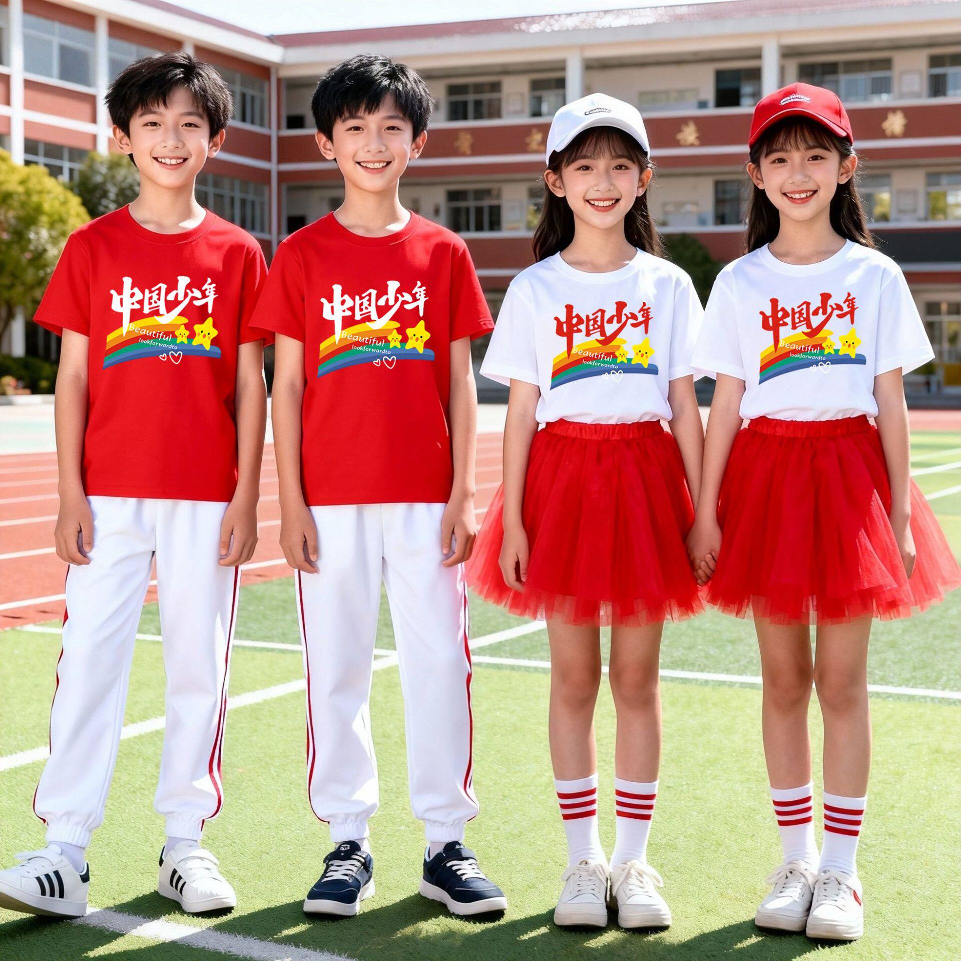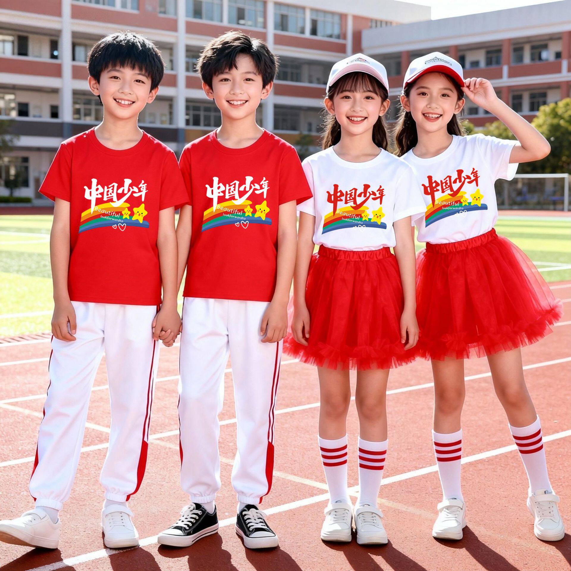 中国少年儿童彩色短袖T恤小学生初中生啦啦队活动表演班服红色t恤