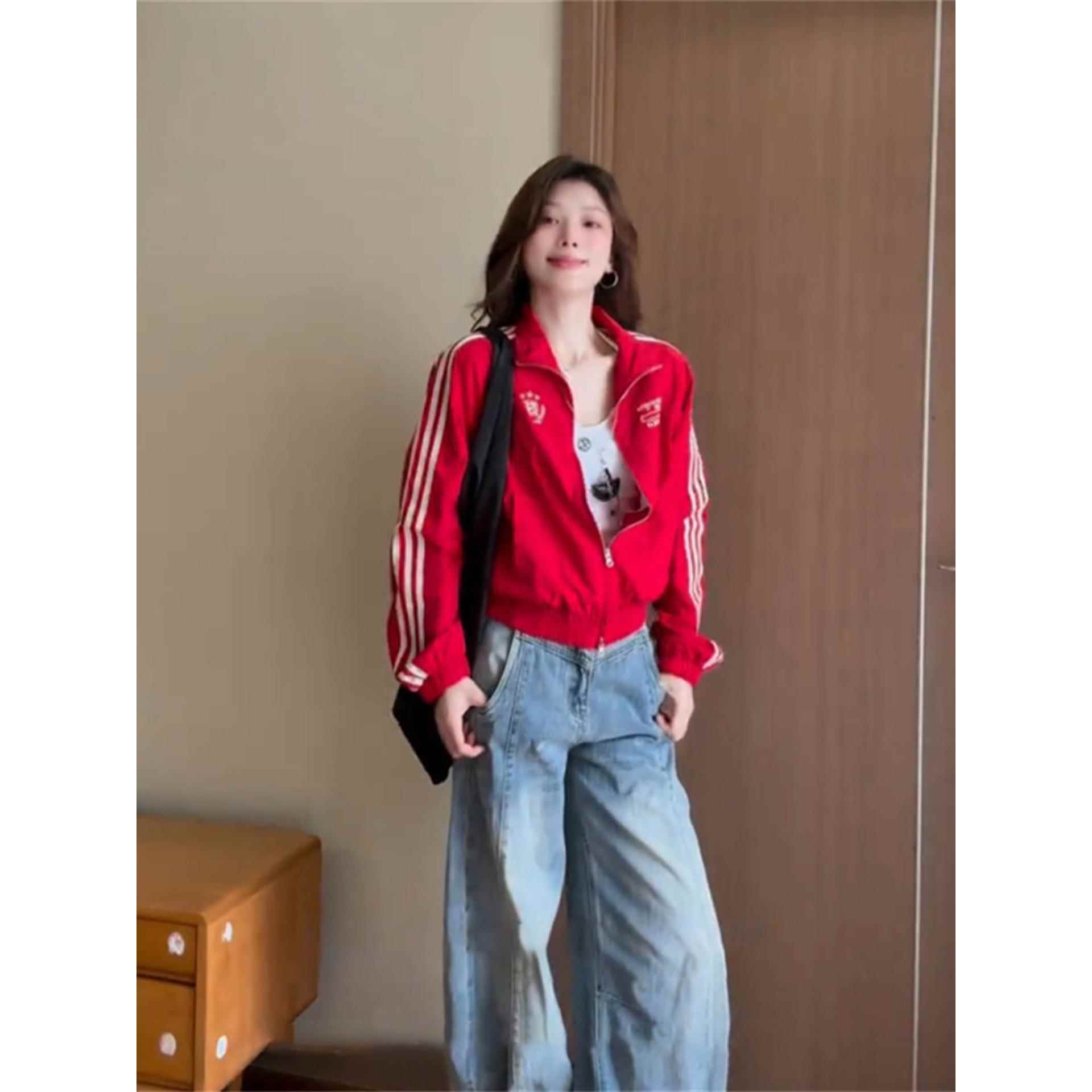 2025潮牌三条杠红色字母绣花立领外套女春秋设计感学院风棒球服潮