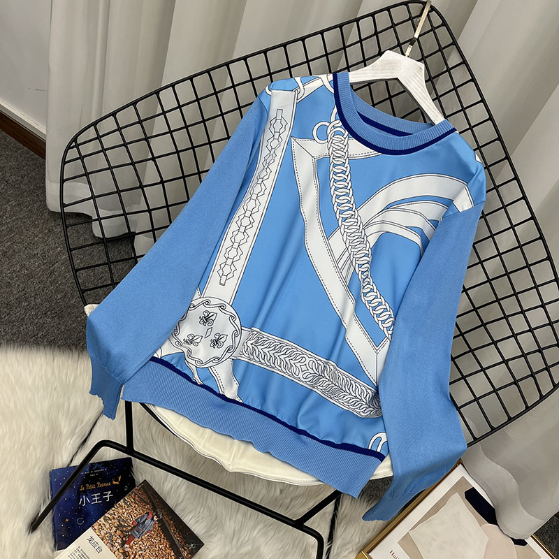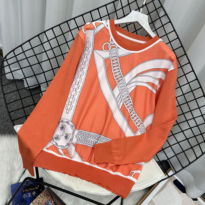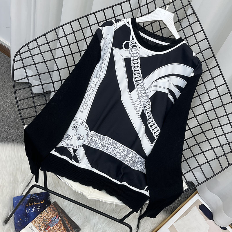 2023春季新款圆领缎面印花拼接针织衫女复古宽松薄款打底上衣T恤