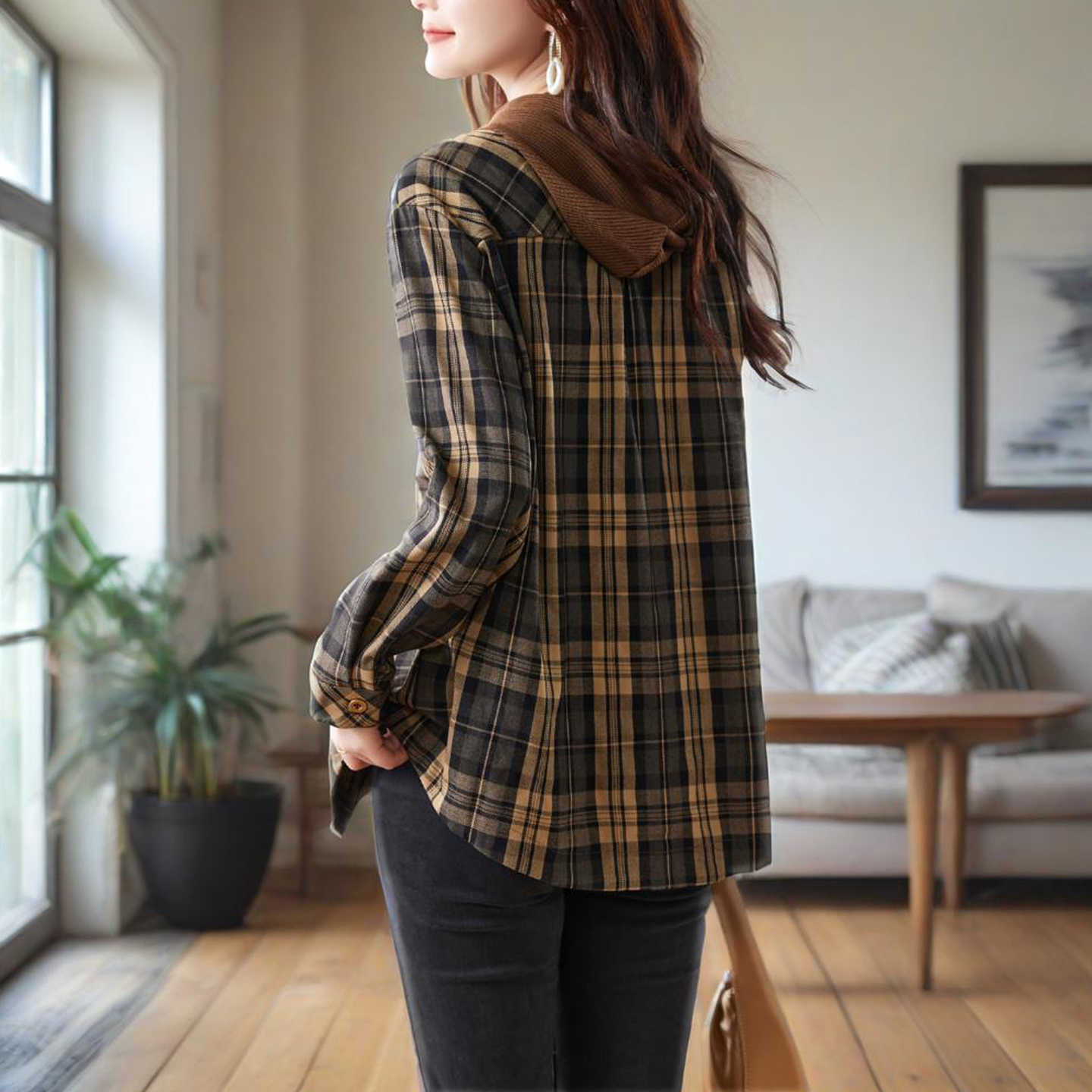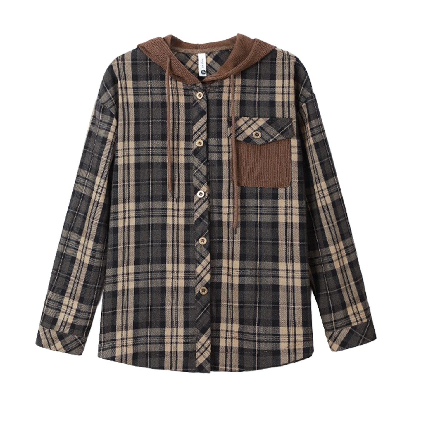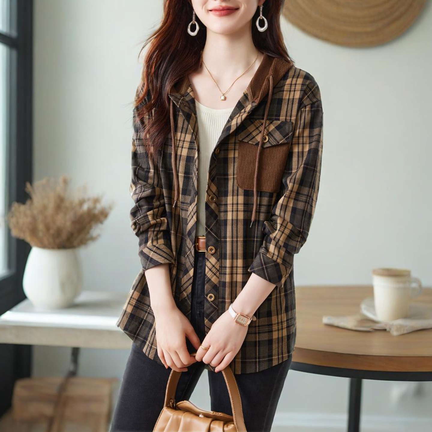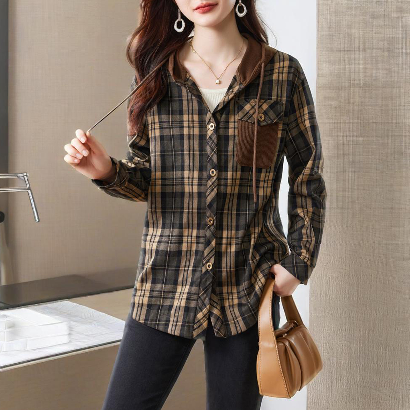 连帽格纹衬衫外套女秋装2025新款休闲宽松衬衣大码女装中长款上衣