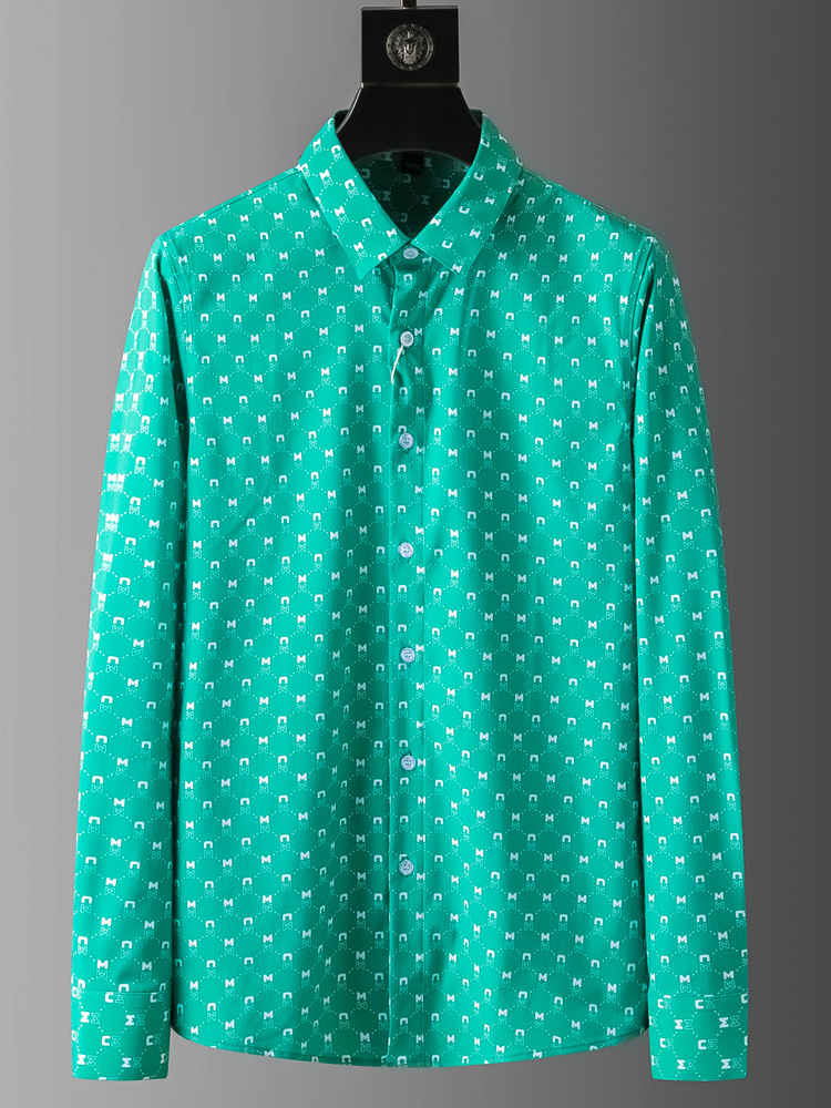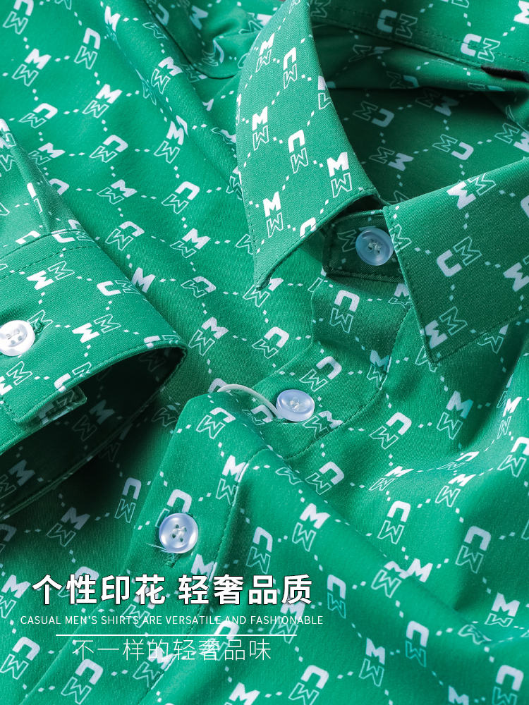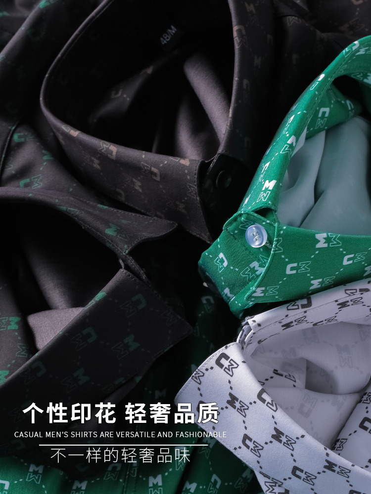 轻奢个性印花衬衫男长袖休闲修身潮流时尚帅气免烫寸衫绿色衬衣男