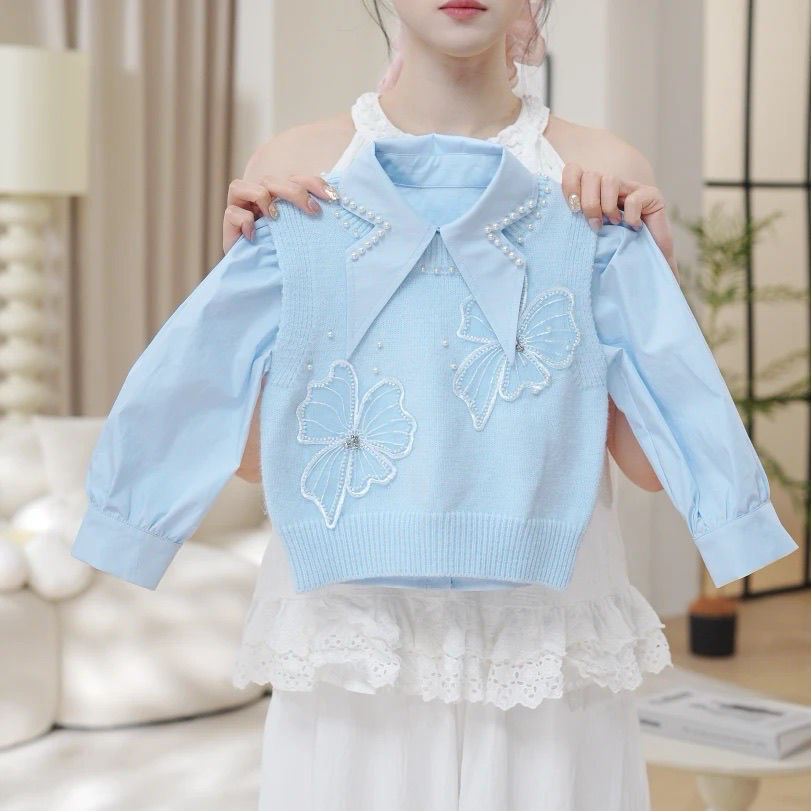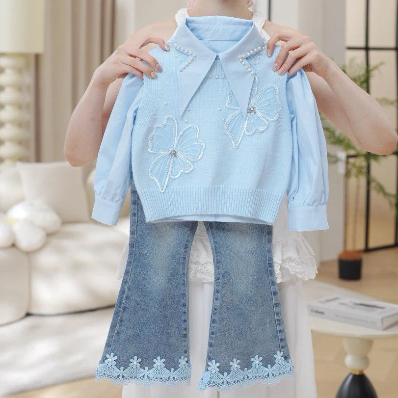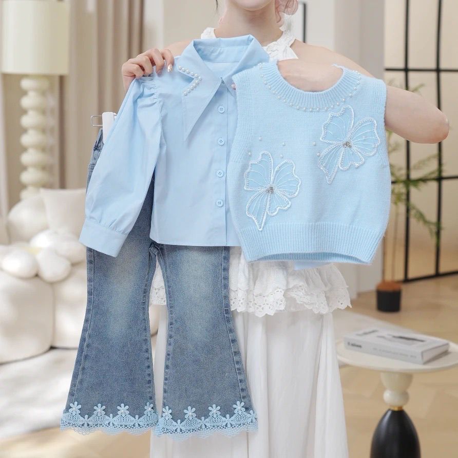 女童春秋新款套装2025宝宝洋气纯棉衬衫马甲牛仔裤三件套蝴蝶结