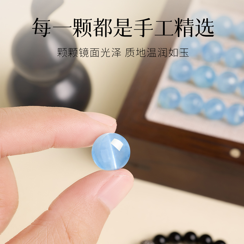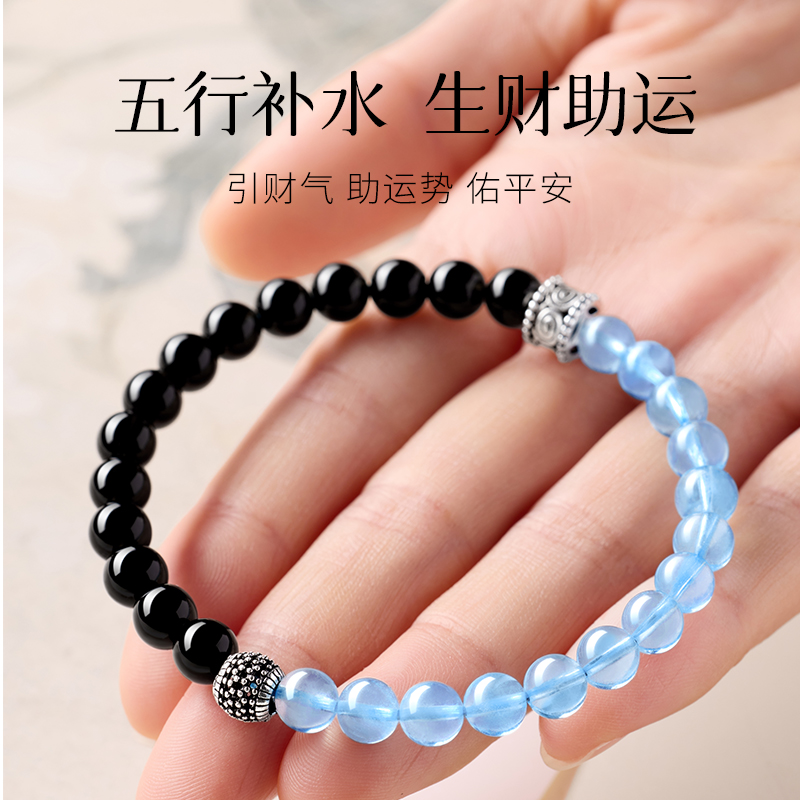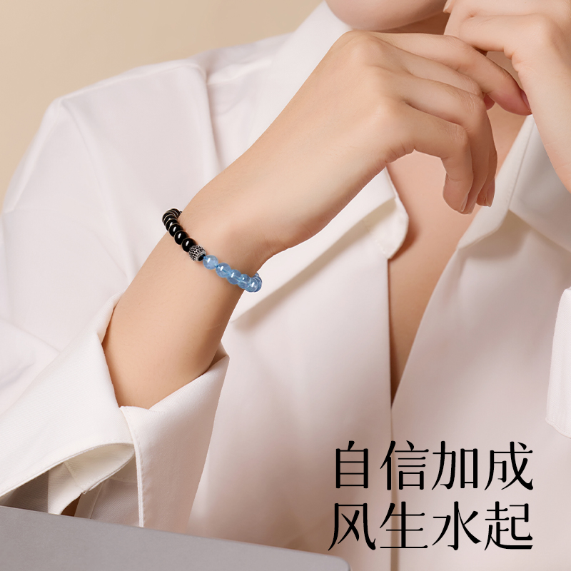 普陀山庆祥泰天然黑曜石海蓝宝水晶手串女款官方招财转运补水手链