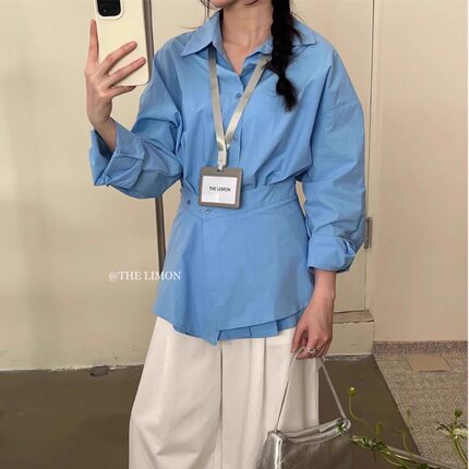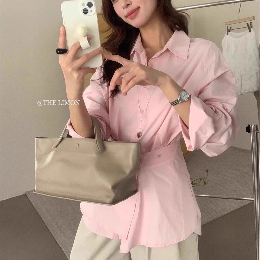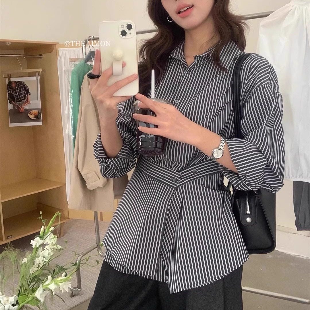 2026新款可调节收腰设计条纹长袖衬衫时尚港味春装显瘦polo领上衣