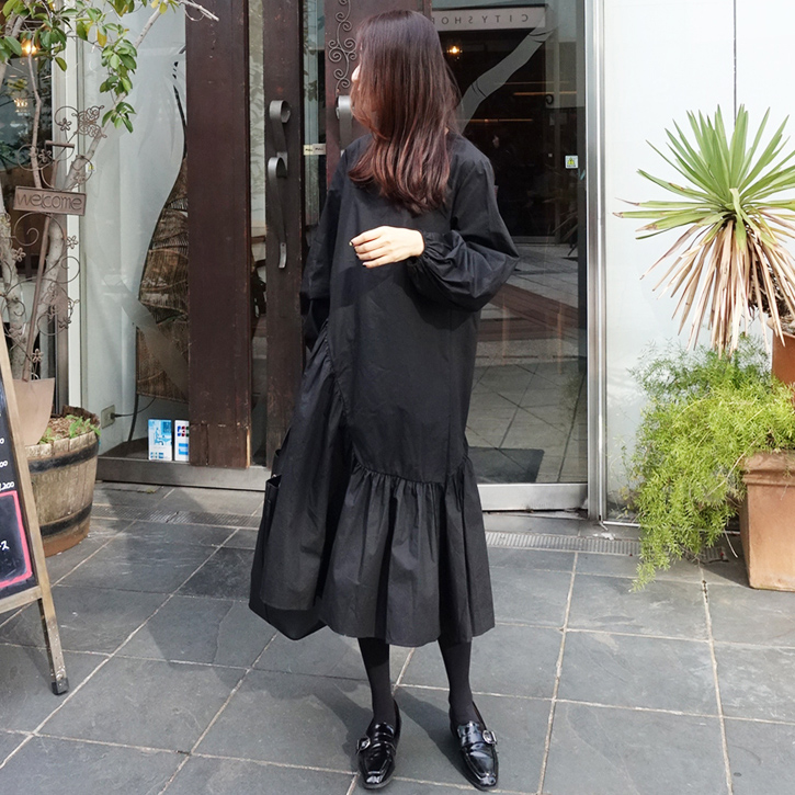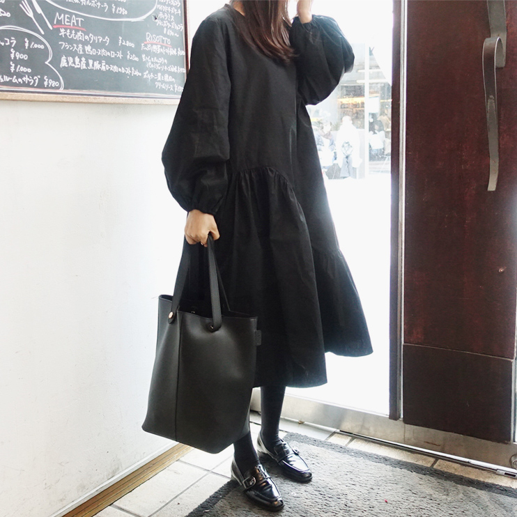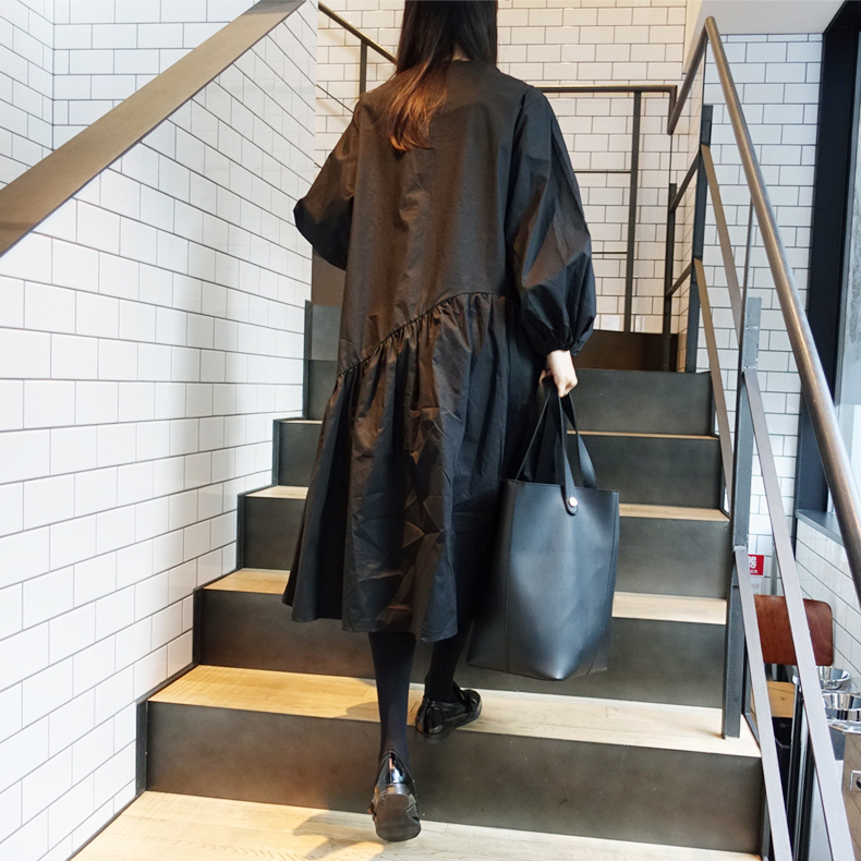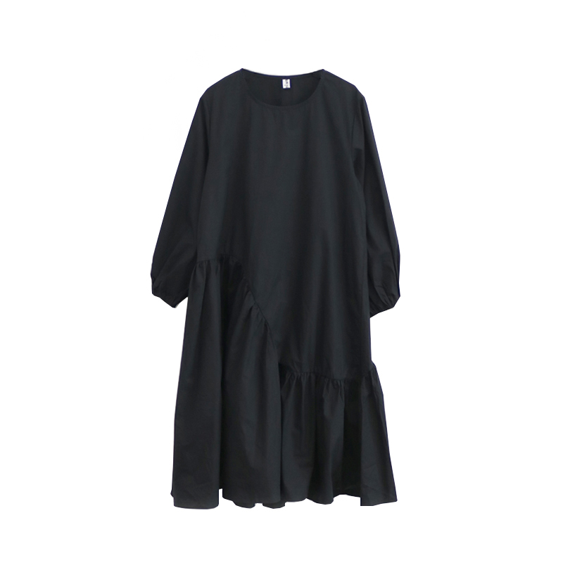 春秋新款黑色不规则中长款连衣裙中长裙女士宽松显瘦灯笼袖长裙子