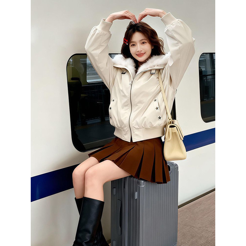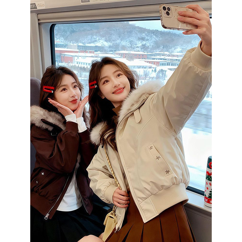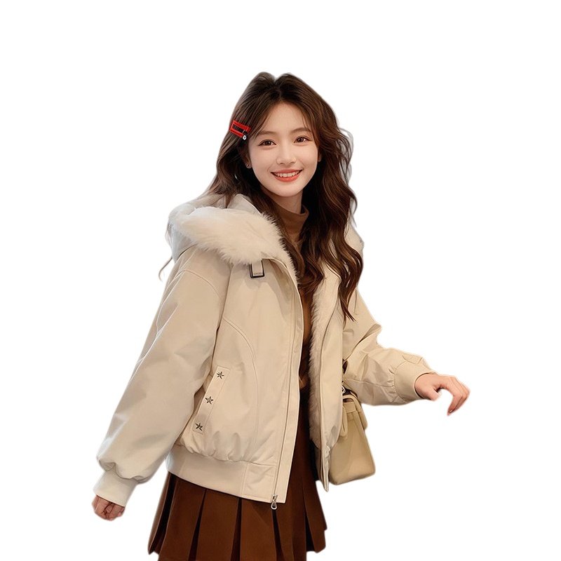法式温柔甜美风杏色毛毛领连帽棉服外套冬日高级休闲宽松保暖棉衣