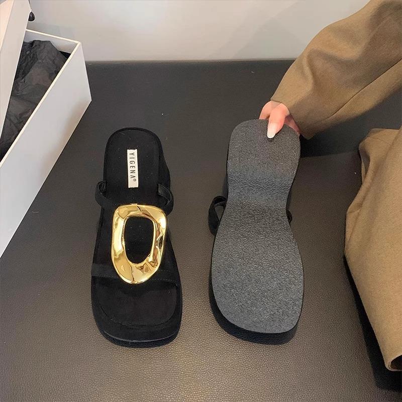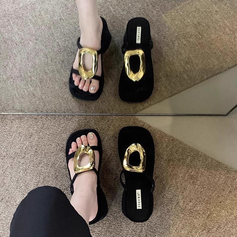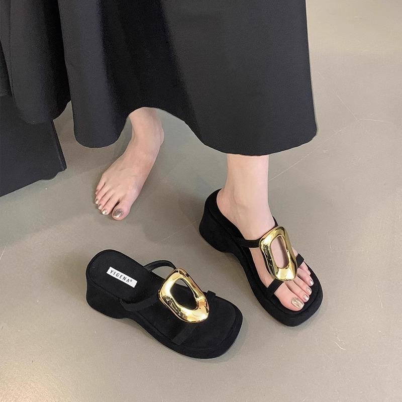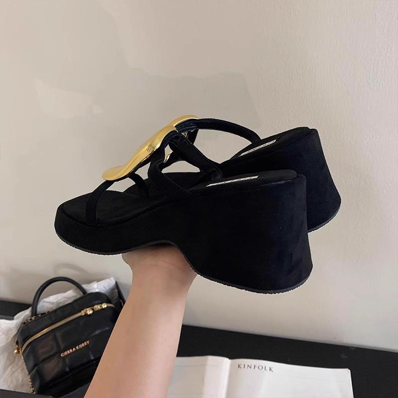 英国真皮坡跟增高凉拖鞋女夏季外穿2025新款法式配裙子黑色高跟鞋