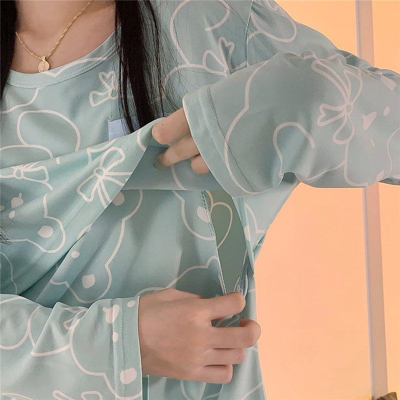 月子服夏季长袖孕妇孕期睡衣产后纯棉哺乳上衣P夏天春秋薄款绿色