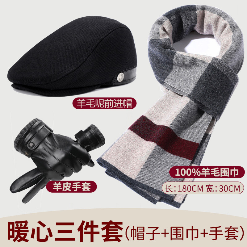 男士羊毛围巾帽子手套三件套中老年人冬季加厚保暖中年爸爸礼盒装