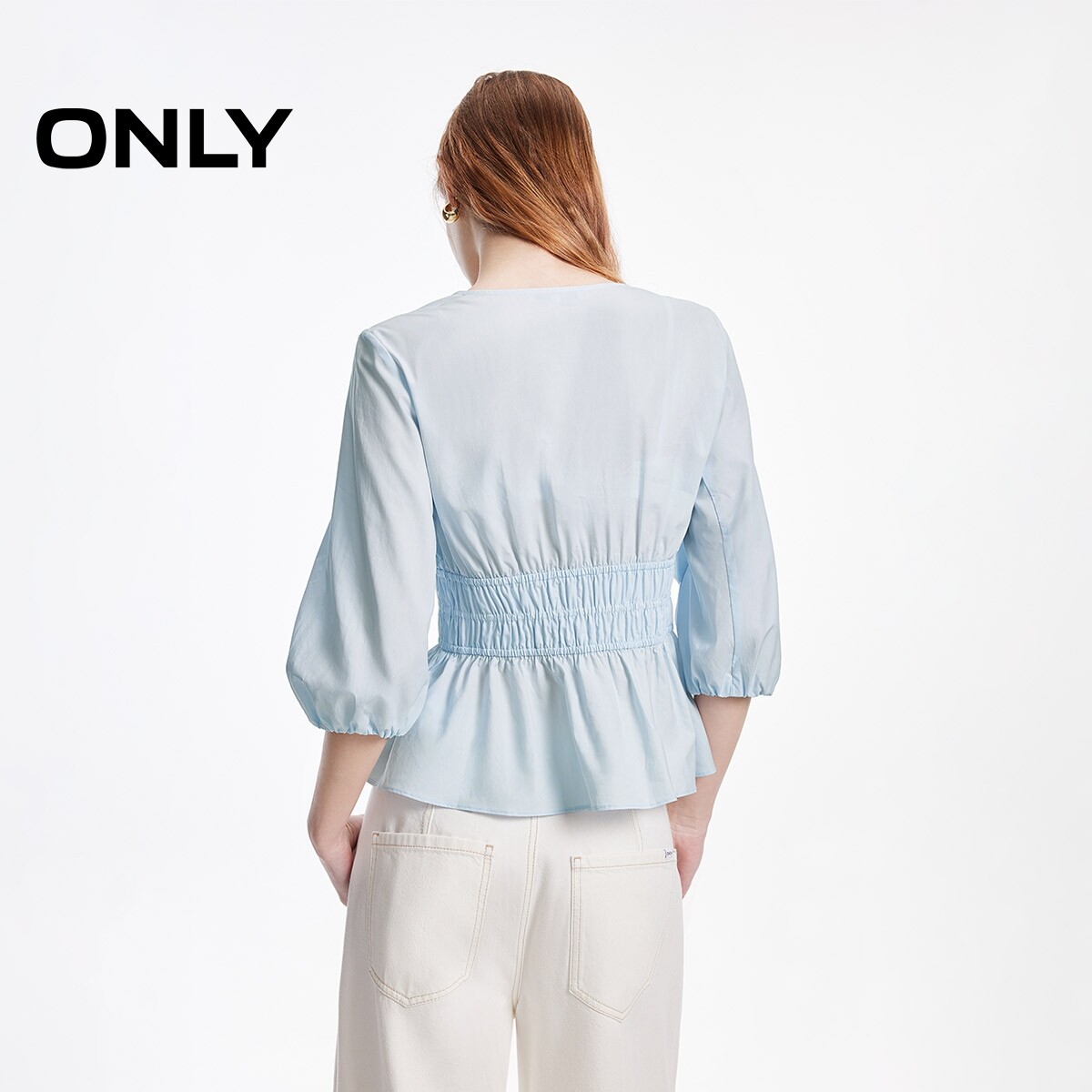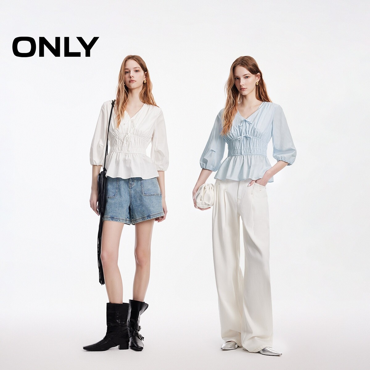 ONLY2026春季新款蝴蝶结装饰纯色收腰抽褶V领七分袖灯笼蕾丝衫女