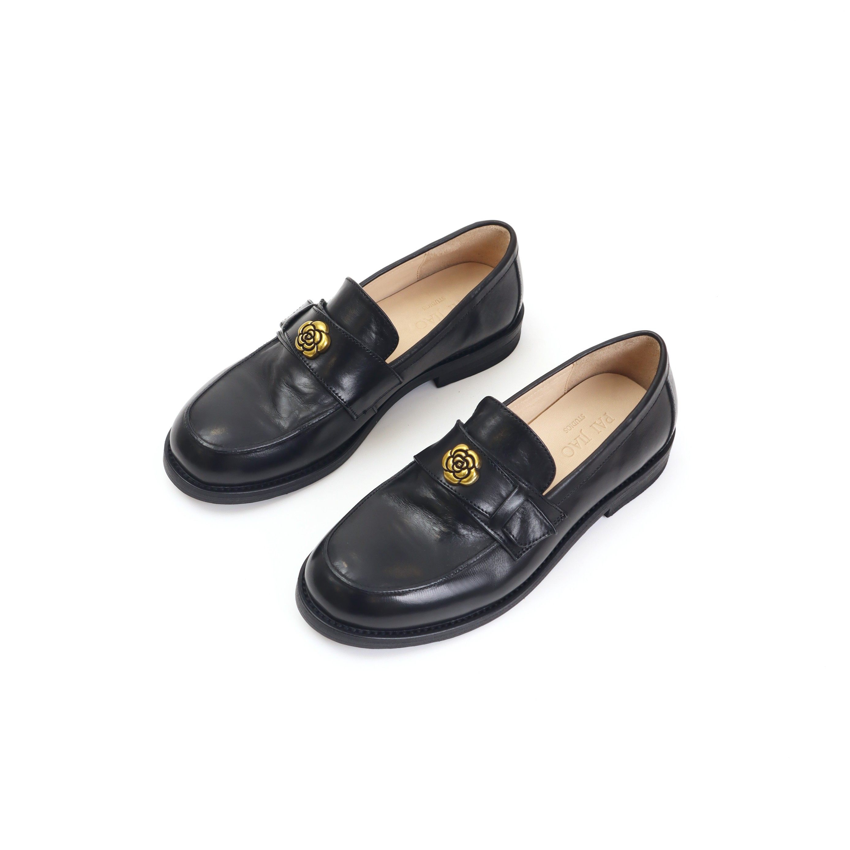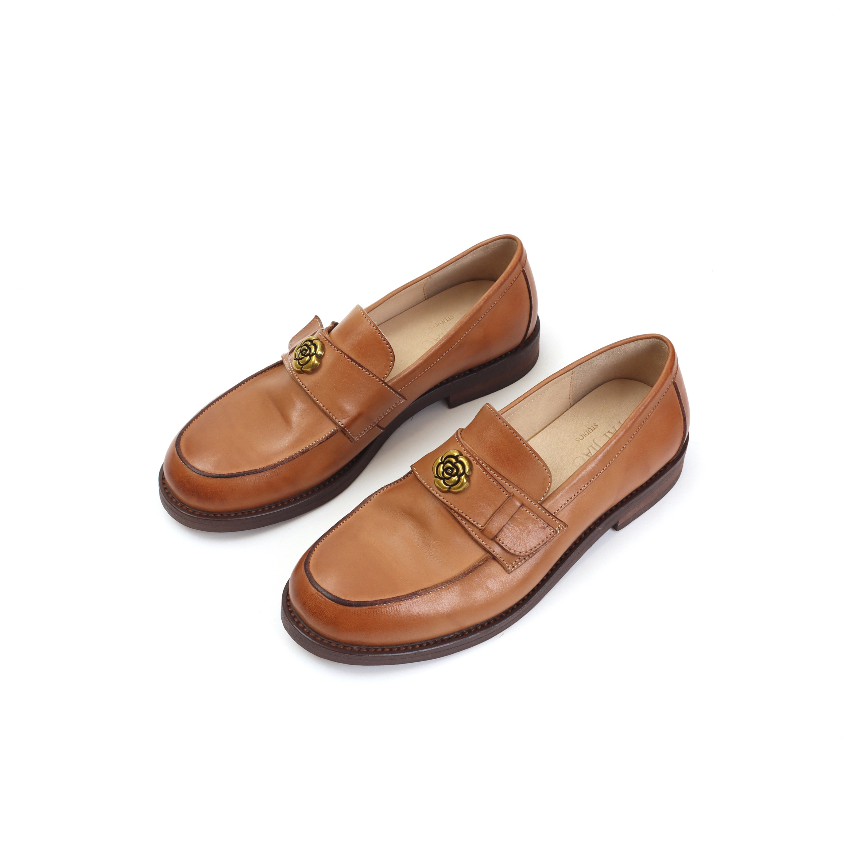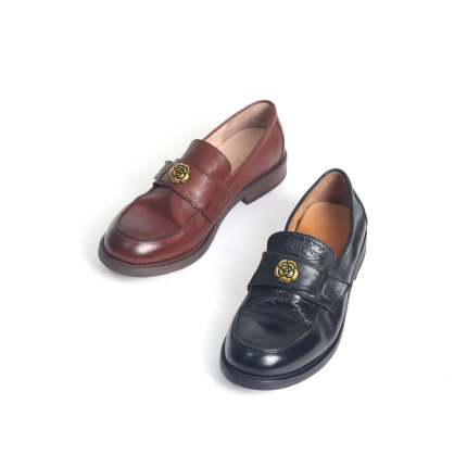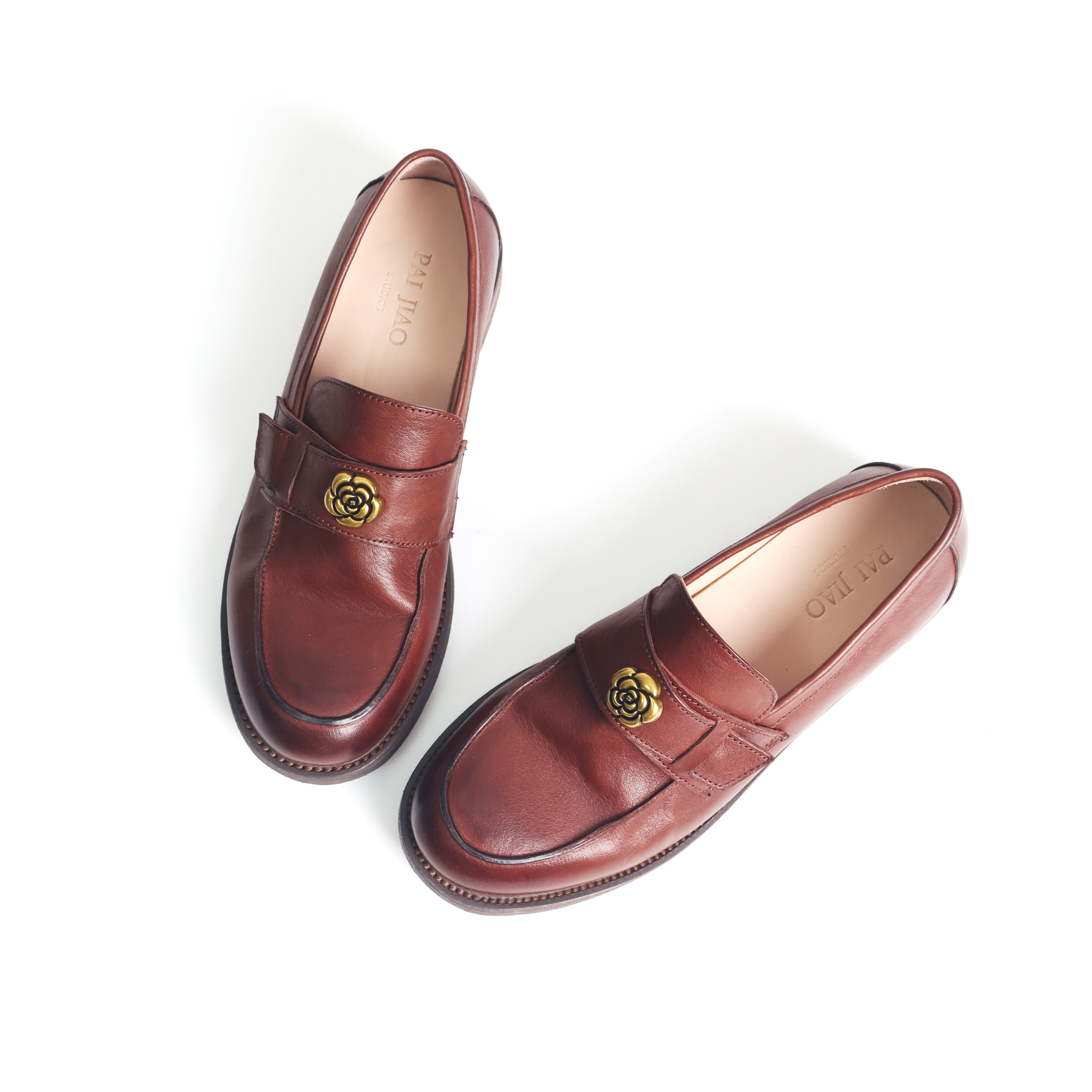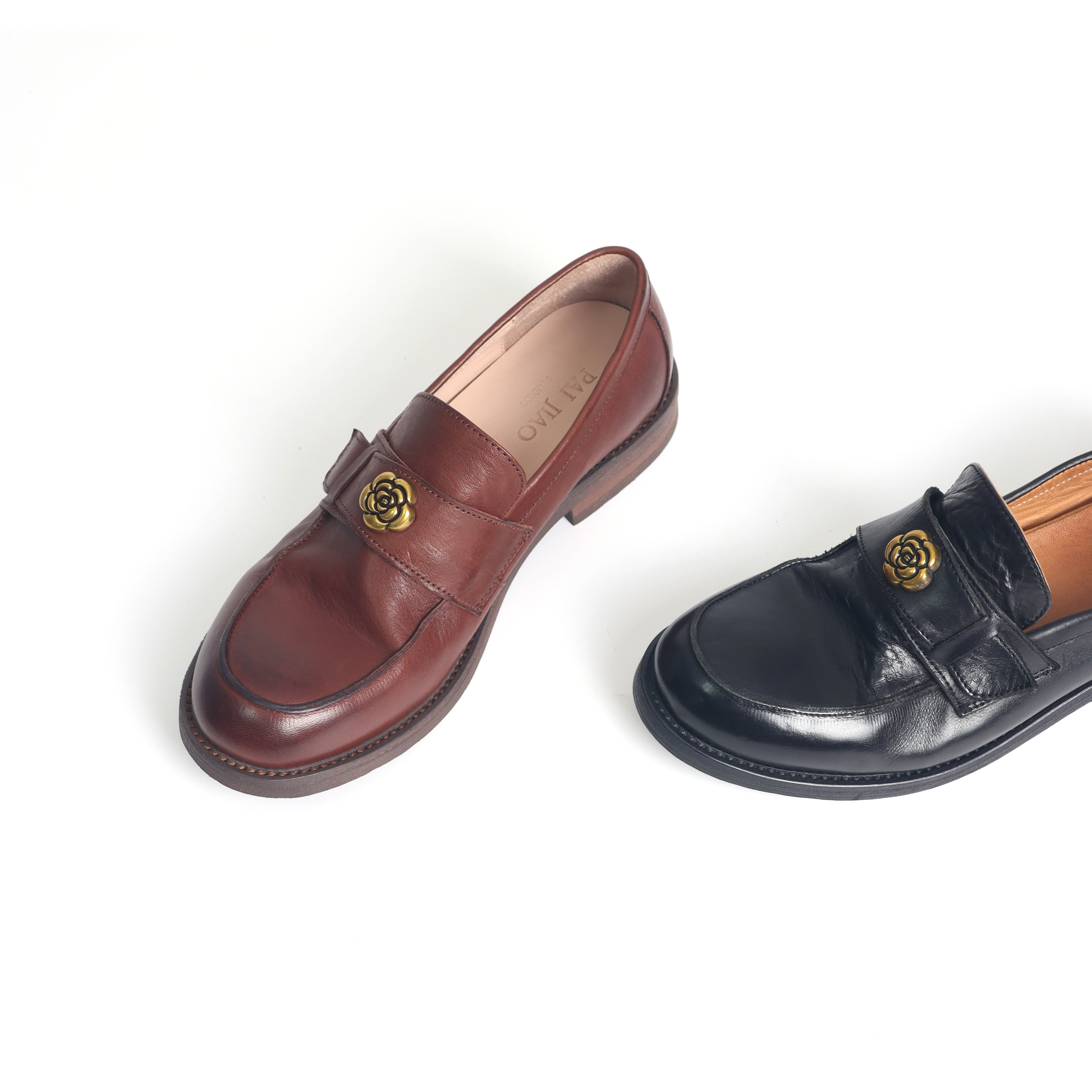 手工马皮山茶花乐福鞋英伦风圆头平底单鞋通勤小皮鞋3558-1
