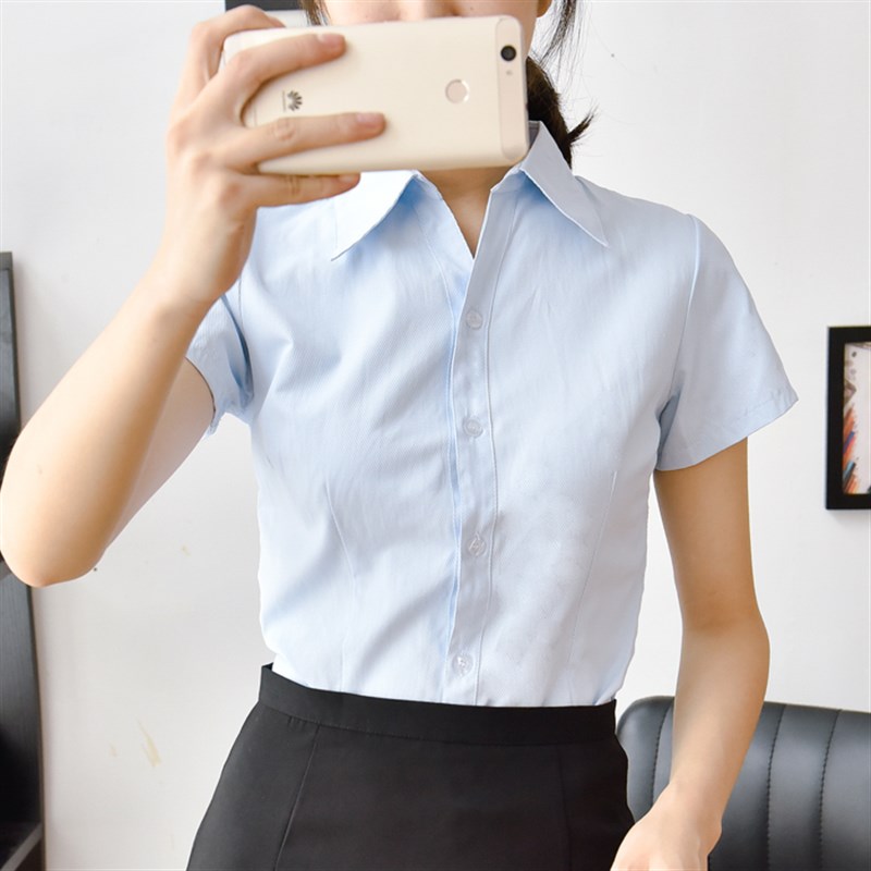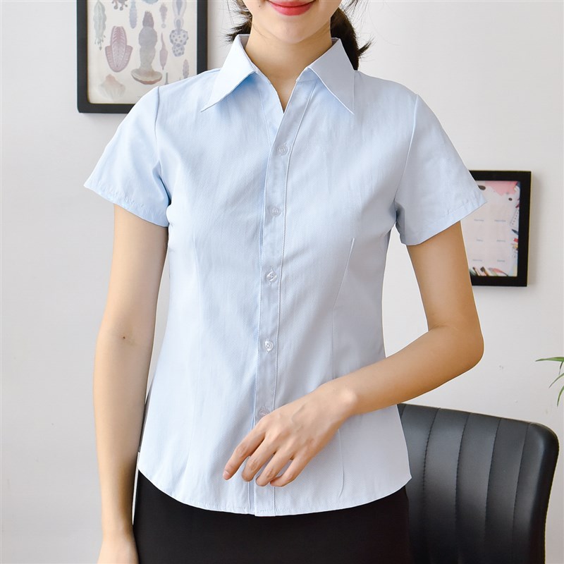 新款女士浅蓝斜纹短袖衬衫V领职业装工装大码收腰棉面试上班白寸