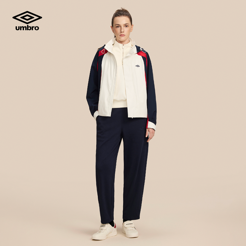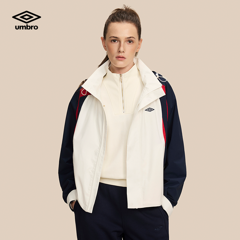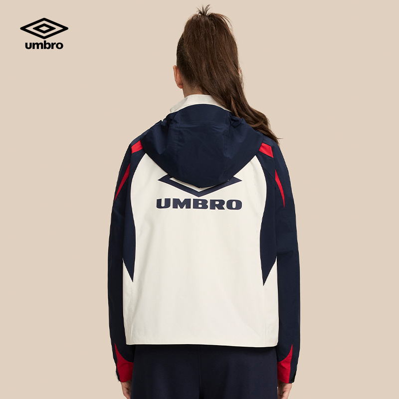 umbro茵宝梭织外套春季女款复古拼接色训练连帽可拆卸足球风夹克