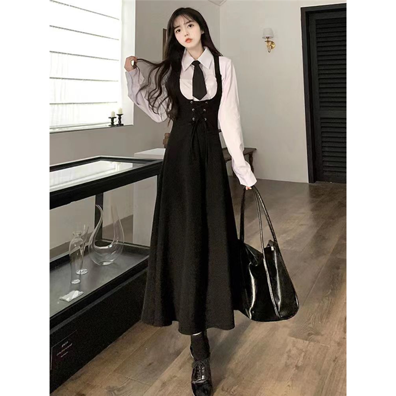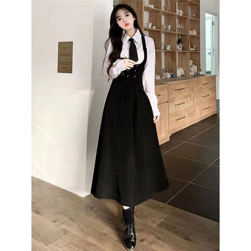 胖MM200斤特大码学院风制服背带连衣裙收腰显瘦吊带长裙两件套装