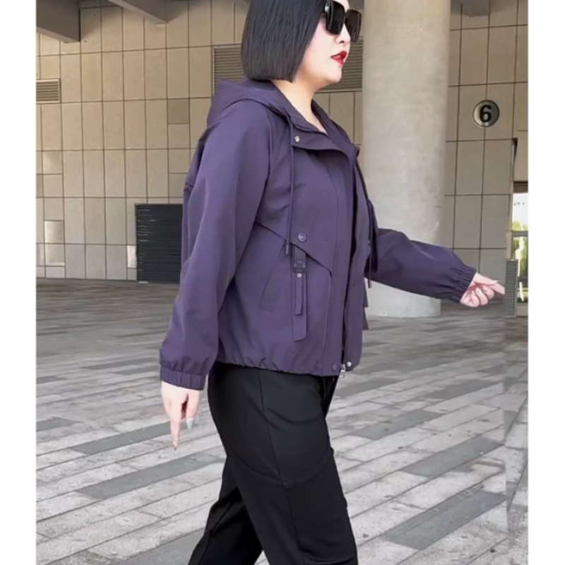中年妈妈宽松外套秋冬新款纯色连帽上衣短款时尚长袖双口袋开衫女