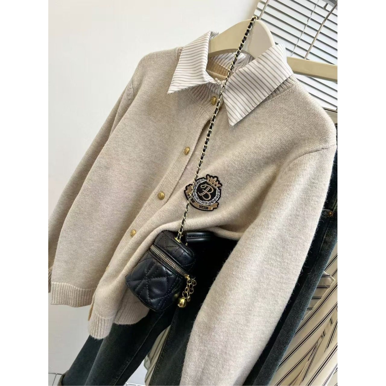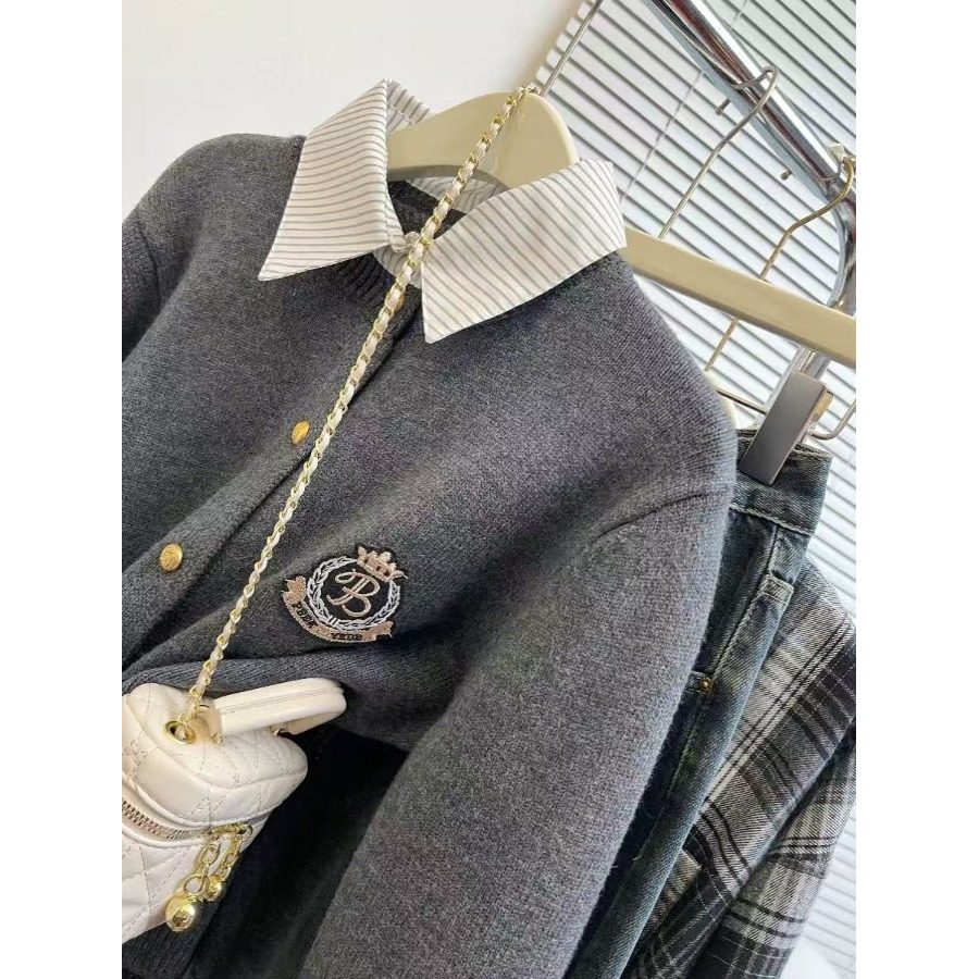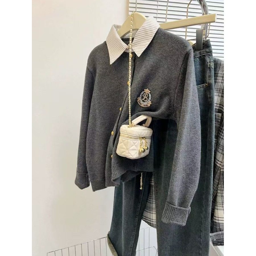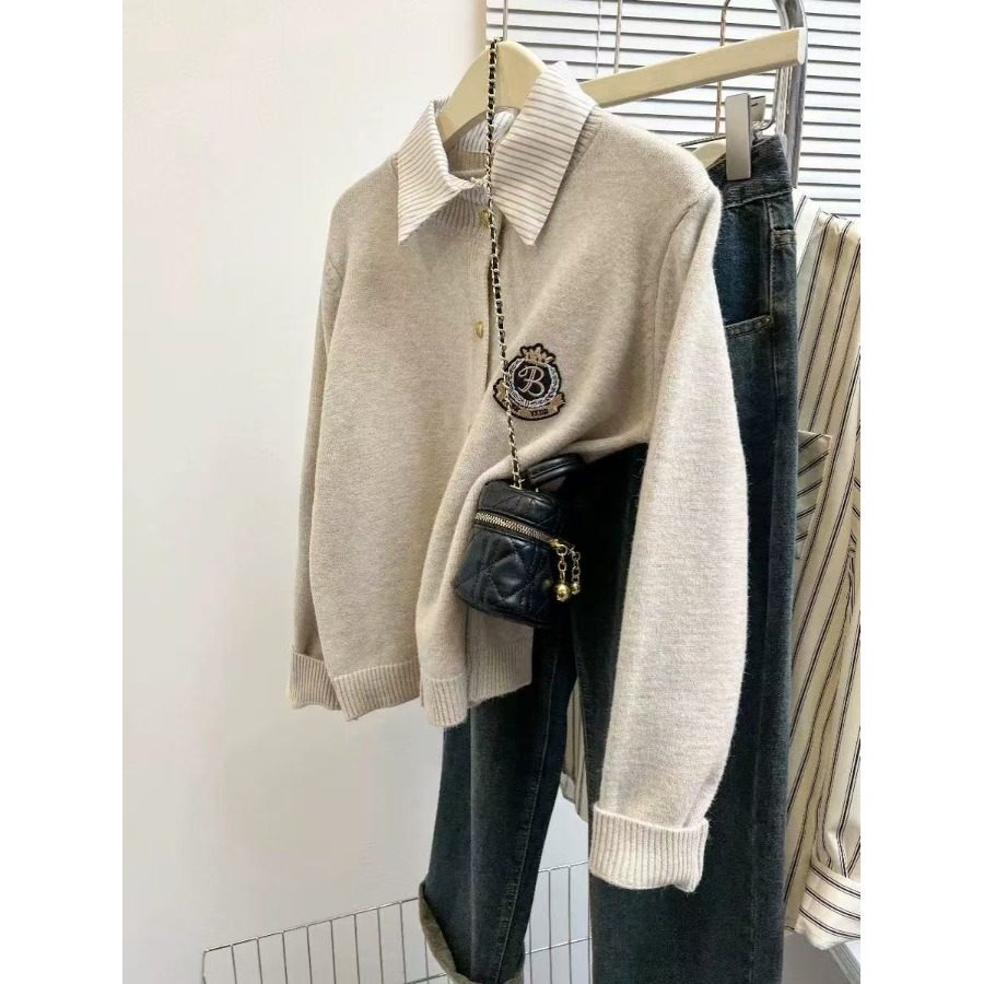 学院风假两件毛衣女秋冬季加厚内搭打底衫上衣短款衬衫领针织开衫