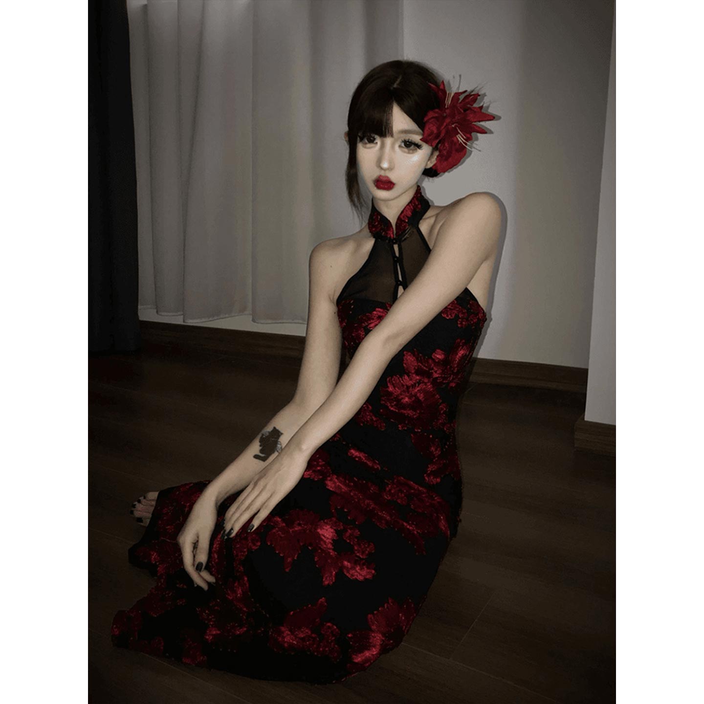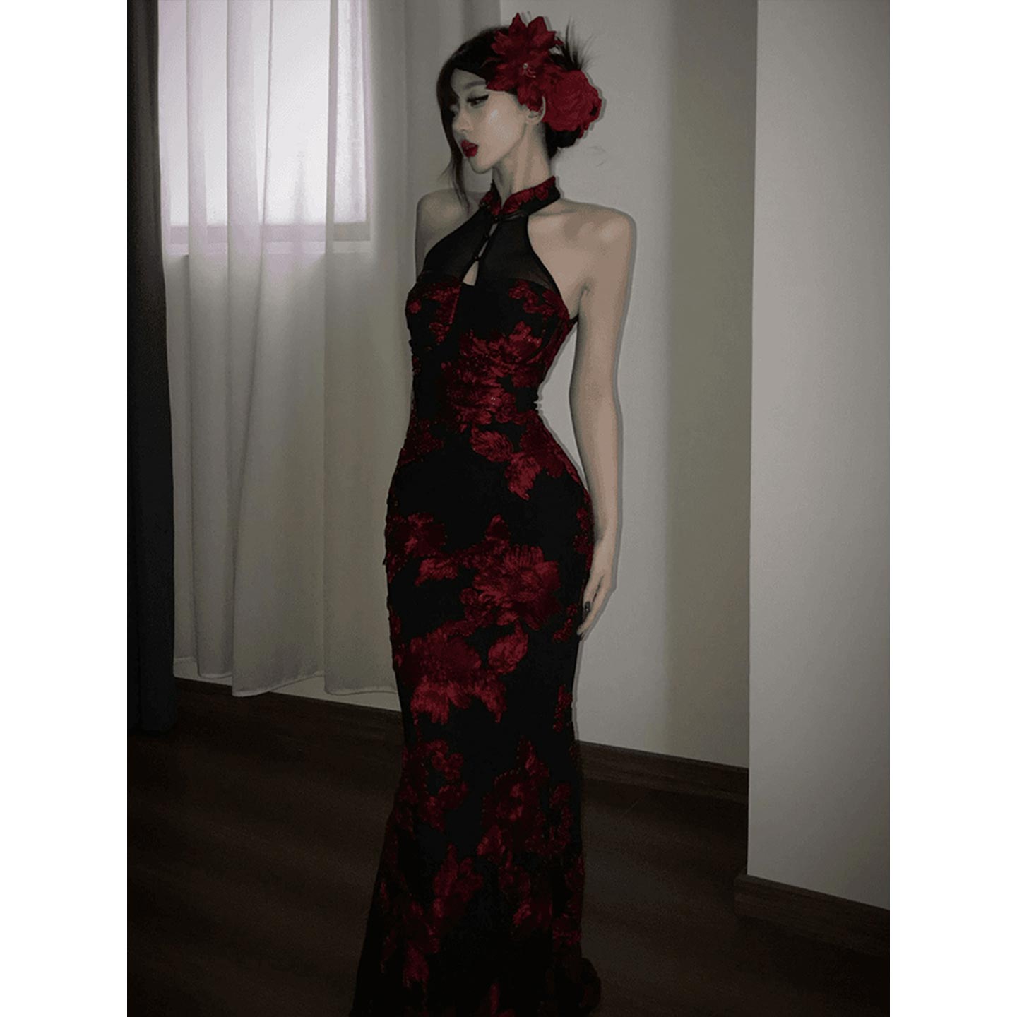XZY 微胖性感新中式紫色挂脖连衣裙女25年夏季复古优雅收腰包臀裙